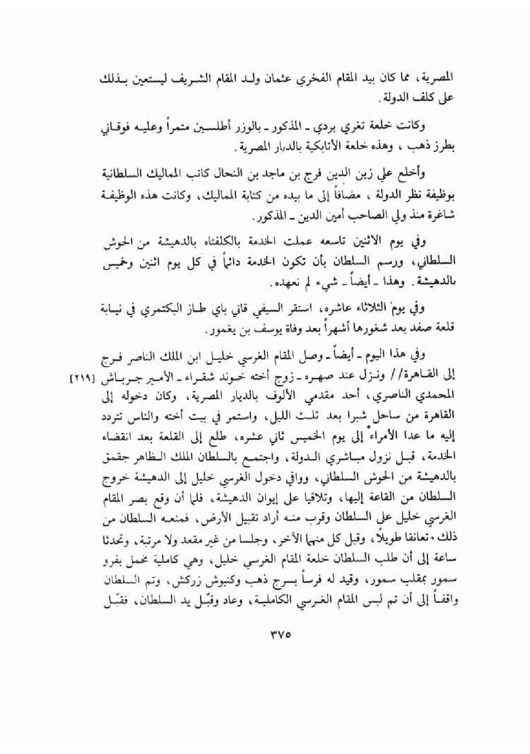 ونال خليل بن الملك الناصر فرج عند صهره زوج أخت خوند شقراء جرباش المحمدي أحد المقدمين بالديار المصرية وكان دخله إلى القاهر من ساحل شهرا بعد ثلث الليل واستمر في بيت أخته والناس يترددون إليه ما عدا الأمراء إلى يوم الخميس ثاني عشرة فطلع إلى القلعة بعد انقضاء الخدمة وقبل نزول المباشرين فاجتمع بالسلطان بالدهشية من الحوش وصادف دخوله خروج السلطان وقرب منه أراد تقبيل الأرض فمنعه السلطان من ذلك وتعانقا طويلا وقبل كل منهما الآخر ثم جلسا من غير مقعد ولا مرتبة فتحادثا ساعة وطلب السلطان الخلعة وهي كاملية مخمل بفرو وسمور بمقلب سمور وقيد له فرساً بسرج ذهب وكنبوش زركش وانتصب السلطان قائما حتى لبسها الغرسي وعاد وقبل يد السلطان فقبل