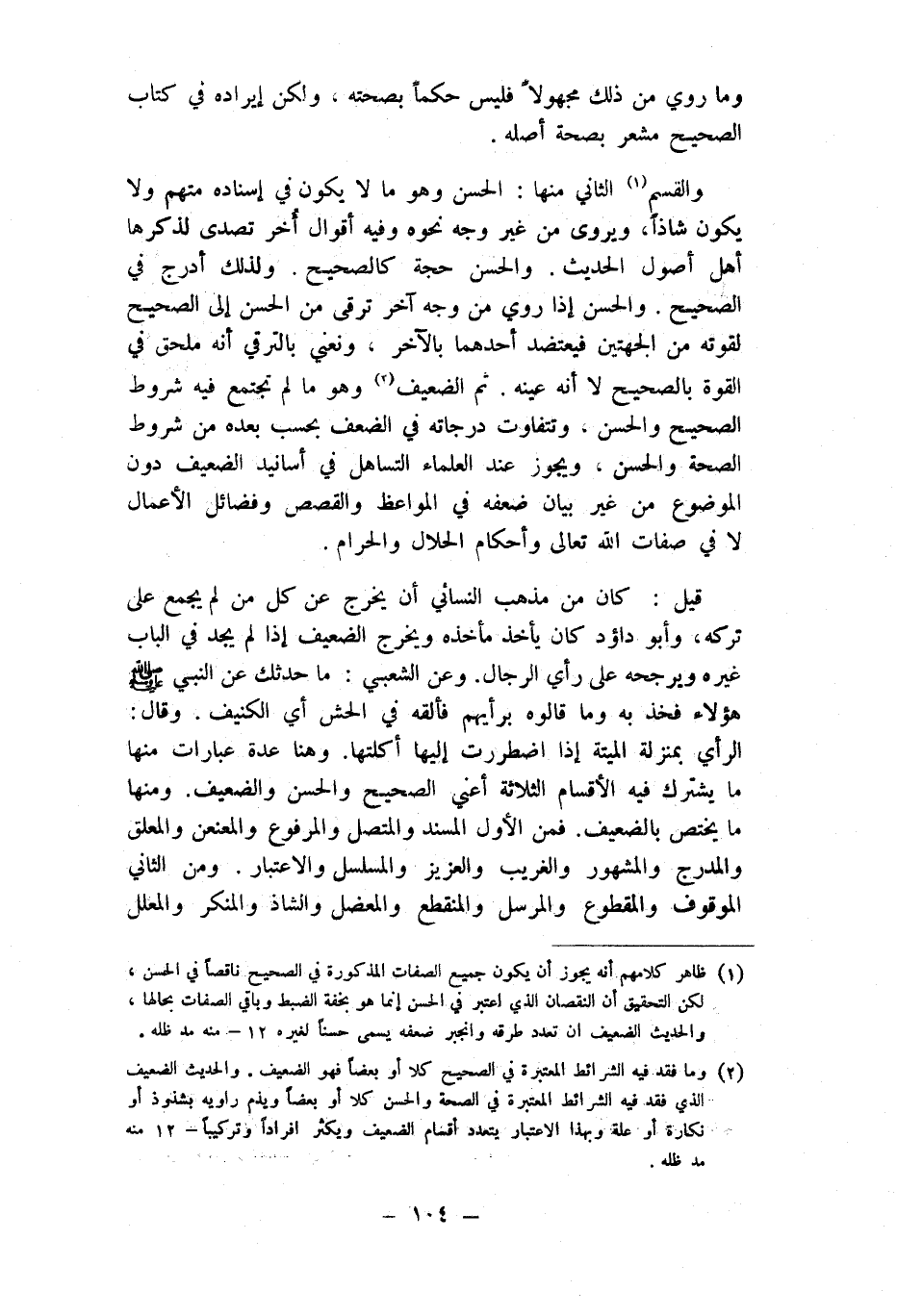 وَالْقسم الثَّانِي مِنْهَا الْحسن وهوما لَا يكون فِي إِسْنَاده مُتَّهم وَلَا يكون شاذا ويروى من غير وَجه نَحوه وَفِيه أَقْوَال أخر تصدى لذكرها أهل أصُول الحَدِيث وَالْحسن حجَّة كَالصَّحِيحِ وَلذَلِك أدرج فِي الصَّحِيح وَالْحسن إِذا رُوِيَ من وَجه آخر ترقى من الْحسن إِلَى الصَّحِيح لقُوته من الْجِهَتَيْنِ فيعتضد أَحدهمَا بِالْآخرِ ونعني بالترقي أَنه مُلْحق فِي الْقُوَّة بِالصَّحِيحِ لَا أَنه عينه ثمَّ الضَّعِيف وَهُوَ مالم تَجْتَمِع فِيهِ شُرُوط الصَّحِيح وَالْحسن وَيجوز عِنْد الْعلمَاء التساهل فِي أَسَانِيد الضَّعِيف دون الْمَوْضُوع من غير بَيَان ضعفه فِي المواعظ والقصص وفضائل الْأَعْمَال لَا فِي صِفَات الله تَعَالَى وَأَحْكَام الْحَلَال وَالْحرَام