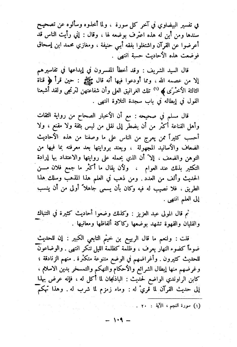 قَالَ السَّيِّد الشريف وَقد أَخطَأ الْمُفَسِّرُونَ فِي إيداعها فِي تفاسيرهم إِلَّا من عصمه الله وَمِمَّا أودعوا فِيهَا أَنه قَالَ صلى الله عَلَيْهِ وَسلم حِين قَرَأَ {وَمَنَاة الثَّالِثَة الْأُخْرَى} تِلْكَ الغرانيق العلى وَأَن شفاعتهن لترتجى وَلَقَد أشبعنا القَوْل فِي إِبْطَاله فِي بَاب سَجْدَة التِّلَاوَة انْتهى