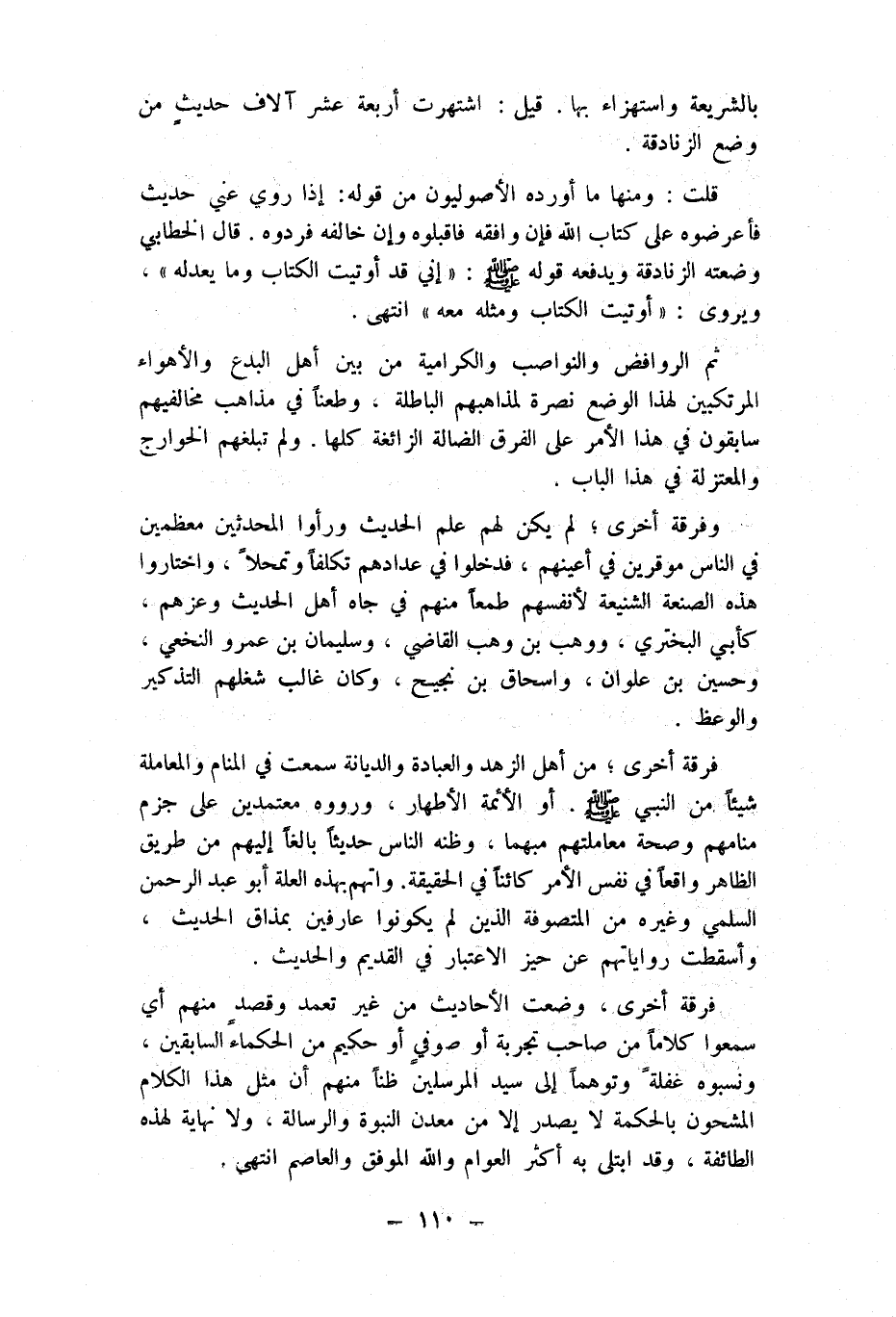 فرقة أُخْرَى وضعت الْأَحَادِيث من غير تعمد وَقصد مِنْهُم أَي سمعُوا كلَاما من صَاحب تجربة أَو صوفي أَو حَكِيم من الْحُكَمَاء السَّابِقين ونسبوه غَفلَة وتوهما إِلَى سيد الْمُرْسلين ظنا مِنْهُم أَن مثل هَذَا الْكَلَام المشحون بالحكمة لَا يصدر إِلَّا من مَعْدن النُّبُوَّة والرسالة وَلَا نِهَايَة لهَذِهِ الطَّائِفَة وَقد ابتلى بِهِ أَكثر الْعَوام وَالله الْمُوفق والعاصم انْتهى