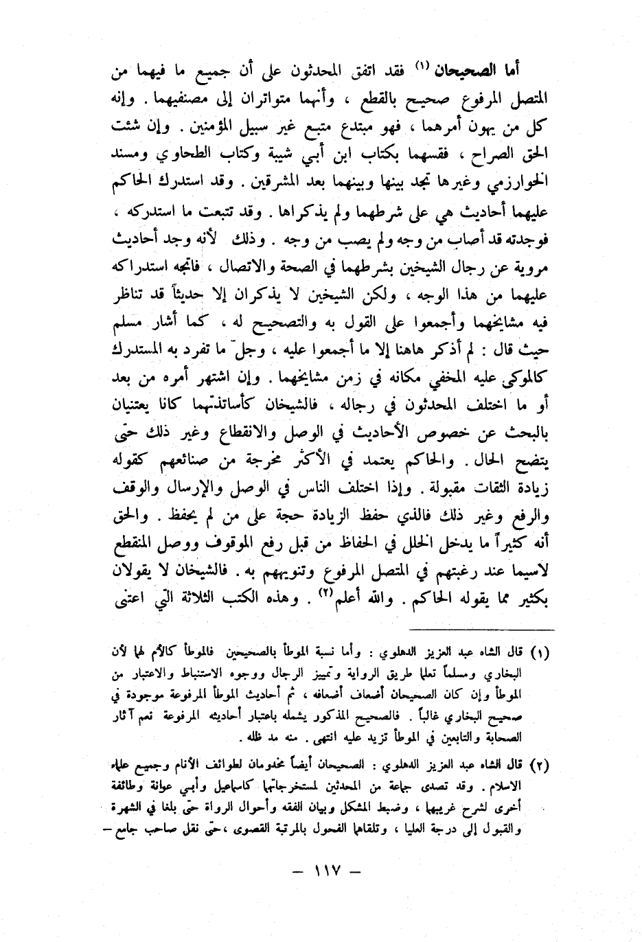 أما الصحيحان فقد اتّفق المحدثون على أَن جَمِيع مَا فيهمَا من الْمُتَّصِل الْمَرْفُوع صَحِيح بِالْقطعِ وأنهما متواتران إِلَى مصنفيهما وَإنَّهُ كل من يهون أَمرهمَا فَهُوَ مُبْتَدع مُتبع غير سَبِيل الْمُؤمنِينَ وَإِن شِئْت الْحق الصراح فقسهما بِكِتَاب ابْن أبي شيبَة وَكتاب الطَّحَاوِيّ ومسند الْخَوَارِزْمِيّ وَغَيرهَا تَجِد بَينهَا وَبَينهمَا بعد المشرقين وَقد استدرك الْحَاكِم عَلَيْهِمَا أَحَادِيث هِيَ على شَرطهمَا وَلم يذكراها وَقد تتبعت مَا استدركه فَوَجَدته قد أصَاب من وَجه وَلم يصب من وَجه وَذَلِكَ لِأَنَّهُ وجد أَحَادِيث مروية عَن رجال الشَّيْخَيْنِ بشرطهما فِي الصِّحَّة والاتصال فاتجه استدراكه عَلَيْهِمَا من هَذَا الْوَجْه وَلَكِن الشَّيْخَيْنِ لَا يذكران إِلَّا حَدِيثا قد تناظر فِيهِ مشايخهما وَأَجْمعُوا على القَوْل بِهِ والتصحيح لَهُ كَمَا أَشَارَ مُسلم حَيْثُ قَالَ لم أذكر هَاهُنَا إِلَّا مَا أَجمعُوا عَلَيْهِ وَجل مَا تفرد بِهِ الْمُسْتَدْرك كالموكى عَلَيْهِ المخفي مَكَانَهُ فِي زمن مشايخهما وَإِن اشْتهر أمره من بعد أَو مَا اخْتلف المحدثون فِي رِجَاله فالشيخان كأساتذتهما كَانَا يعتنيان بالبحث عَن خُصُوص الْأَحَادِيث فِي الْوَصْل والانقطاع وَغير ذَلِك حَتَّى يَتَّضِح الْحَال وَالْحَاكِم يعْتَمد فِي الْأَكْثَر مخرجة من صنائعهم كَقَوْلِه زِيَادَة الثِّقَات مَقْبُولَة وَإِذا اخْتلف النَّاس فِي الْوَصْل والإرسال وَالْوَقْف وَالرَّفْع وَغير ذَلِك فَالَّذِي حفظ الزِّيَادَة حجَّة على من لم يحفظ وَالْحق أَنه كثيرا مَا يدْخل الْخلَل فِي الْحفاظ من قبل رفع الْمَوْقُوف وَوصل المنطقع لَا سِيمَا عِنْد رغبتهم فِي الْمُتَّصِل الْمَرْفُوع وتنويههم بِهِ فالشيخان لَا يَقُولَانِ بِكَثِير مِمَّا يَقُوله الْحَاكِم وَالله أعلم وَهَذِه الْكتب الثَّلَاثَة الَّتِي اعتني