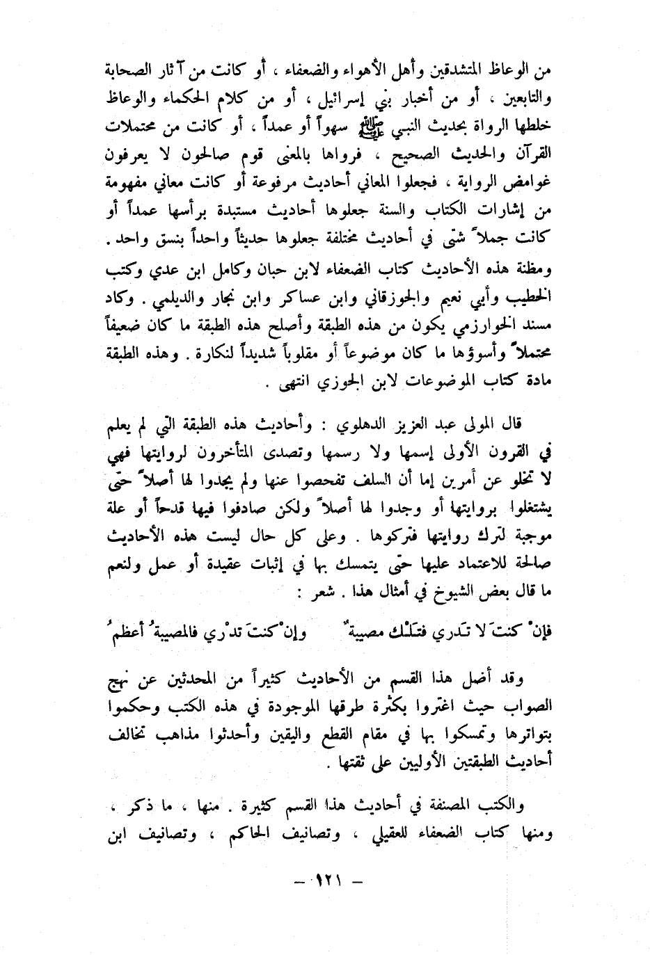 قَالَ الْمولى عبد الْعَزِيز الدهلوي وَأَحَادِيث هَذِه الطَّبَقَة الَّتِي لم يعلم فِي الْقُرُون الأولى إسمها وَلَا رسمها وتصدى الْمُتَأَخّرُونَ لروايتها فَهِيَ لَا تَخْلُو عَن أَمريْن إِمَّا أَن السّلف تفحصوا عَنْهَا وَلم يَجدوا لَهَا أصلا حَتَّى يشتغلوا بروايتها أَو وجدوا لَهَا أصلا وَلَكِن صادفوا فِيهَا قدحا أَو عِلّة مُوجبَة لترك رِوَايَتهَا فتركوها وعَلى كل حَال لَيست هَذِه الْأَحَادِيث صَالِحَة للاعتماد عَلَيْهَا حَتَّى يتَمَسَّك بهَا فِي إِثْبَات عقيدة أَو عمل ولنعم مَا قَالَ بعض الشُّيُوخ فِي أَمْثَال هَذَا شعر