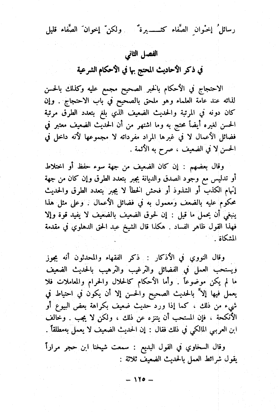 الِاحْتِجَاج فِي الْأَحْكَام بالْخبر الصَّحِيح مجمع عَلَيْهِ وَكَذَلِكَ بالْحسنِ لذاته عِنْد عَامَّة الْعلمَاء وَهُوَ مُلْحق بِالصَّحِيحِ فِي بَاب الِاحْتِجَاج وَإِن كَانَ دونه فِي الْمرتبَة والْحَدِيث الضَّعِيف الَّذِي بلغ بِتَعَدُّد الطّرق مرتبَة الْحسن لغيره أَيْضا مُحْتَج بِهِ وَمَا اشْتهر من أَن الحَدِيث الضَّعِيف مُعْتَبر فِي فَضَائِل الْأَعْمَال لَا فِي غَيرهَا المُرَاد مفرداته لَا مجموعها لِأَنَّهُ دَاخل فِي الْحسن لَا فِي الضَّعِيف صرح بِهِ الْأَئِمَّة