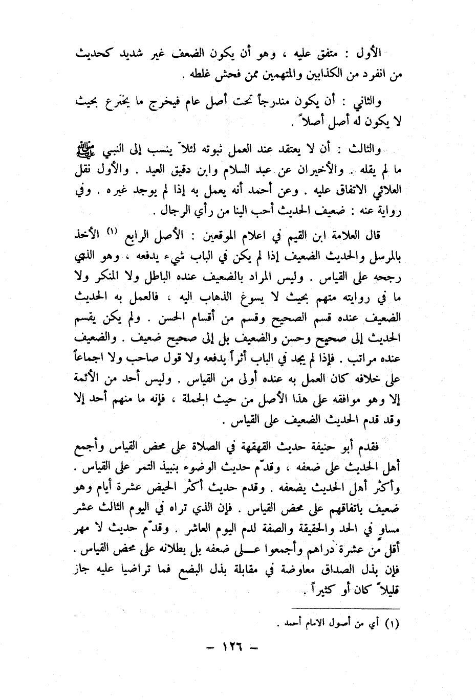 قَالَ الْعَلامَة ابْن الْقيم فِي اعلام الموقعين الأَصْل الرَّابِع الْأَخْذ بالمرسل والْحَدِيث الضَّعِيف إِذا لم يكن فِي الْبَاب شَيْء يَدْفَعهُ وَهُوَ الَّذِي رَجحه على الْقيَاس وَلَيْسَ المُرَاد بالضعيف عِنْده الْبَاطِل وَلَا الْمُنكر وَلَا مَا فِي رِوَايَته مُتَّهم بِحَيْثُ لَا يسوغ الذّهاب إِلَيْهِ فَالْعَمَل بِهِ الحَدِيث الضَّعِيف عِنْده قسم الصَّحِيح وَقسم من أَقسَام الْحسن وَلم يكن يقسم الحَدِيث إِلَى صَحِيح وَحسن والضعيف بل إِلَى صَحِيح ضَعِيف والضعيف عِنْده مَرَاتِب فَإِذا لم يجد فِي الْبَاب أثرا يَدْفَعهُ وَلَا قَول صَاحب وَلَا اجماعا على خِلَافه كَانَ الْعَمَل بِهِ عِنْده أولى من الْقيَاس وَلَيْسَ أحد من الْأَئِمَّة إِلَّا وَهُوَ مُوَافقَة على هَذَا الأَصْل من حَيْثُ الْجُمْلَة فَإِنَّهُ مَا مِنْهُم أحد إِلَّا وَقد قدم الحَدِيث الضَّعِيف على الْقيَاس