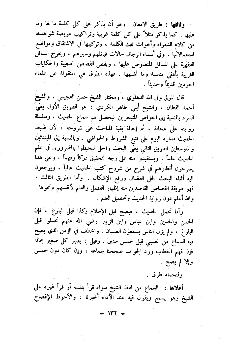 قَالَ الْمولى ولي الله الدهلوي ومختار الشَّيْخ حسن العجيمي وَالشَّيْخ أَحْمد الْقطَّان وَالشَّيْخ أبي طَاهِر الْكرْدِي هُوَ الطَّرِيق الأول يَعْنِي السرد بِالنِّسْبَةِ إِلَى الْخَواص المتبحرين ليحصل لَهُم سَماع الحَدِيث وسلسلة رِوَايَته على عجالة ثمَّ إِحَالَة بَقِيَّة المباحث على شروحه لِأَن ضبط الحَدِيث مَدَاره الْيَوْم على تتبع الشُّرُوط والحواشي وبالنسبة إِلَى المبتدئين والمتوسطين الطَّرِيق الثَّانِي يَعْنِي الْبَحْث والحل ليحيطوا بالضروري فِي علم الحَدِيث علما ويستفيدوا مِنْهُ على وَجه التَّحْقِيق دركا وفهما وعَلى هَذَا يسرحون أنظارهم فِي شرح من شُرُوح كتب الحَدِيث غَالِبا ويرجعون إِلَيْهِ أثْنَاء الْبَحْث لحل العضال وَرفع الأشكال وَأما الطَّرِيق الثَّالِث فَهُوَ طَريقَة الْقصاص القاصدين مِنْهُ إِظْهَار الْفضل وَالْعلم لأَنْفُسِهِمْ وَنَحْوهَا وَالله أعلم دون رِوَايَة الحَدِيث وَتَحْصِيل الْعلم
