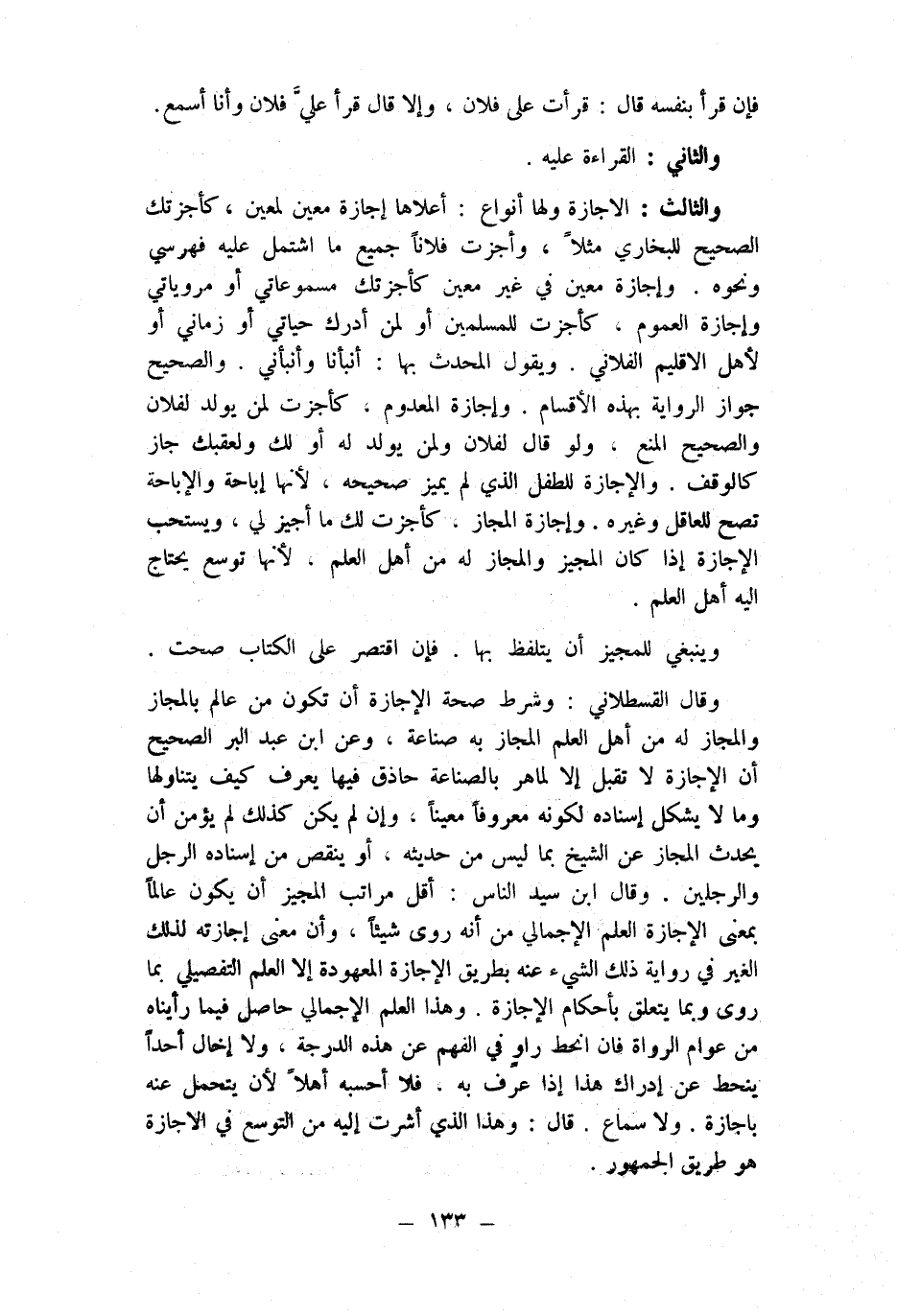 وَقَالَ الْقُسْطَلَانِيّ وَشرط صِحَة الْإِجَازَة أَن تكون من عَالم بالمداز وَالْمجَاز لَهُ من أهل الْعلم الْمجَاز بِهِ صناعَة وَعَن ابْن عبد الْبر الصَّحِيح أَن الْإِجَازَة لَا تقبل إِلَّا لماهر بالصناعة حاذق فِيهَا يعرف كَيفَ يَتَنَاوَلهَا وَمَا لَا يشكل إِسْنَاده لكَونه مَعْرُوفا معينا وَإِن لم يكن كَذَلِك لم يُؤمن أَن يحديث الْمجَاز عَن الشَّيْخ بِمَا لَيْسَ من حَدِيثه أَو ينقص من إِسْنَاده الرجل وَالرّجلَيْنِ وَقَالَ ابْن سيد النَّاس أقل مَرَاتِب الْمُجِيز أَن يكون عَالما بِمَعْنى الْإِجَازَة الْعلم الإجمالي من أَنه روى شَيْئا وَأَن معنى إِجَازَته لذَلِك الْغَيْر فِي رِوَايَة ذَلِك الشَّيْء عَنهُ بطرِيق الْإِجَازَة الْمَعْهُودَة إِلَّا الْعلم التفصيلي بِمَا روى وَبِمَا يتَعَلَّق بِأَحْكَام الْإِجَازَة وَهَذَا الْعلم الإجمالي حَاصِل فِيمَا رَأَيْنَاهُ من عوام الروَاة فان انحط راو فِي الْفَهم عَن هَذِه الدرجَة وَلَا إخال أحدا ينحط عَن إِدْرَاك هَذَا إِذا عرف بِهِ فَلَا أَحْسبهُ أَهلا لِأَن يتَحَمَّل عَنهُ باجازة وَلَا سَماع قَالَ وَهَذَا الَّذِي أَشرت إِلَيْهِ من التَّوَسُّع فِي الاجازة هُوَ طَرِيق الْجُمْهُور