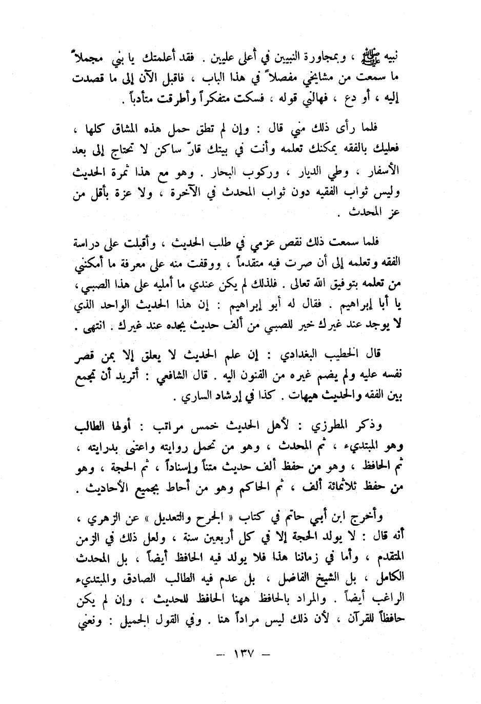 فَلَمَّا رأى ذَلِك مني قَالَ وَإِن لم تطق حمل هَذِه المشاق كلهَا فَعَلَيْك بالفقه يمكنك تعلمه وَأَنت فِي بَيْتك قار سَاكن لَا تحْتَاج إِلَى بعد الآسغر وطي الديار وركوب الْبحار وَهُوَ مَعَ هَذَا ثَمَرَة الحَدِيث وَلَيْسَ ثَوَاب الْفَقِيه دون ثَوَاب الْمُحدث فِي الاخرة وَلَا عزة بِأَقَلّ من عز الْمُحدث