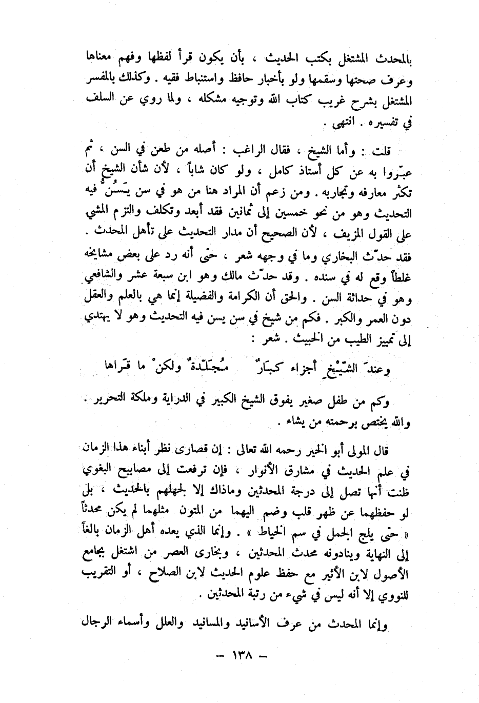 قلت وَأما الشَّيْخ فَقَالَ الرَّاغِب أَصله من طعن فِي السن ثمَّ عبروا بِهِ عَن كل أستاذ كَامِل وَلَو كَانَ شَابًّا لِأَن شَأْن الشَّيْخ أَن تكْثر معارفه وتجاربه وَمن زعم أَن المُرَاد هُنَا من هُوَ فِي سنّ يسن فِيهِ التحديث وَهُوَ من نَحْو خمسين إِلَى ثَمَانِينَ فقد أبعد وتكلف وَالْتزم الْمَشْي على القَوْل المزيف لِأَن الصَّحِيح أَن مدَار التحديث على تأهل الْمُحدث حدث البُخَارِيّ وَمَا فِي وَجهه شعر حَتَّى أَنه رد على بعض مشايخه غَلطا وَقع لَهُ فِي سَنَده وَقد حدث مَالك وَهُوَ ابْن سَبْعَة عشر وَالشَّافِعِيّ وَهُوَ فِي حَدَاثَة السن وَالْحق أَن الْكَرَامَة والفضيلة إِنَّمَا هِيَ بِالْعلمِ وَالْعقل دون الْعُمر وَالْكبر فكم من شيخ فِي سنّ يسن فِيهِ التحديث وَهُوَ لَا يَهْتَدِي إِلَى تَمْيِيز الطّيب من الْخَبيث شعر