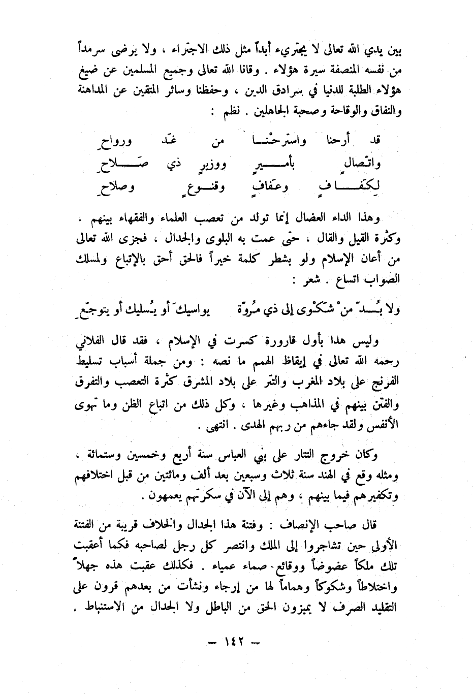 بَين يَدي الله تَعَالَى لَا يجتريء أبدا مثل ذَلِك الاجتراء وَلَا يرضى سرمدا من نَفسه المنصفة سيرة هَؤُلَاءِ وقانا الله تَعَالَى وَجَمِيع الْمُسلمين عَن ضيغ هَؤُلَاءِ الطّلبَة للدنيا فِي سرادق الدّين وحفظنا وَسَائِر الْمُتَّقِينَ عَن المداهنة والنفاق والوقاحة وصحبة الْجَاهِلين نظم