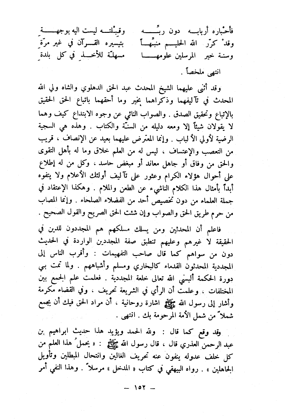 فَاعْلَم أَن الْمُحدثين وَمن يسْلك مسلكهم هم المجددون للدّين فِي الْحَقِيقَة لَا غَيرهم وَعَلَيْهِم تنطبق صفة المجددين الْوَارِدَة فِي الحَدِيث دون من سواهُم كَمَا قَالَ صَاحب التفهيمات وَأقرب النَّاس إِلَى المجددية المحدثون القدماء كالبخاري وَمُسلم وأشباههم وَلما تمت بِي دورة الْحِكْمَة ألبسني الله تَعَالَى خلعة المجددية فَعلمت علم الْجمع بَين المختلفات وَعلمت أَن الرَّأْي فِي الشَّرِيعَة تَحْرِيف وَفِي الْقَضَاء مكرمَة وَأَشَارَ إِلَى رَسُول الله صلى الله عَلَيْهِ وَسلم إِشَارَة روحانية أَن مُرَاد الْحق فِيك أَن يجمع شملا من شَمل الْأمة المرحومة بك انْتهى