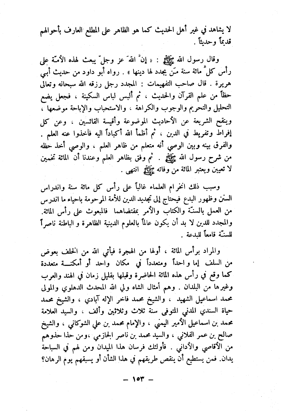 وَالْمرَاد بِرَأْس الْمِائَة أَولهَا من الْهِجْرَة فَيَأْتِي الله من الْخلف بعوض من السّلف إِمَّا وَاحِدًا ومتعددا فِي مَكَان وَاحِد أَو أمكنة مُتعَدِّدَة كَمَا وَقع فِي رَأس هَذِه الْمِائَة الْحَاضِرَة وَقبلهَا بِقَلِيل زمَان فِي الْهِنْد وَالْعرب وَغَيرهَا من الْبلدَانِ وهم أَمْثَال الشاه ولي الله الْمُحدث الدهلوي وَالْمولى مُحَمَّد إِسْمَاعِيل الشَّهِيد وَالشَّيْخ مُحَمَّد فاخر الْإِلَه آبادي وَالشَّيْخ مُحَمَّد حَيَاة السندي الْمدنِي الْمُتَوفَّى سنة ثَلَاث وَثَلَاثِينَ وَألف وَالسَّيِّد الْعَلامَة مُحَمَّد بن اسماعيل الْأَمِير اليمني وَالْإِمَام مُحَمَّد بن عَليّ الشَّوْكَانِيّ وَالشَّيْخ صَالح بن عمر الْفُلَانِيّ وَالسَّيِّد مُحَمَّد بن نَاصِر الجازمي وَمن حذا حذوهم من الأقاصي والأداني فَأُولَئِك فرسَان هَذَا الميدان وَمن لَهُم فِي السباحة يدان فَمن يَسْتَطِيع أَن ينقص طريقهم فِي هَذَا الشَّأْن أَو يسبقهم يَوْم الرِّهَان