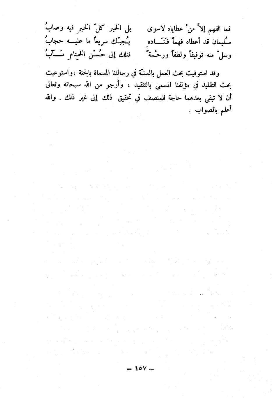 وَقد استوفيت بحث الْعَمَل بِالسنةِ فِي رسالتنا الْمُسَمَّاة بِالْجنَّةِ واستوعبت بحث التَّقْلِيد فِي مؤلفنا الْمُسَمّى بالتنقيد وأرجوا من الله سُبْحَانَهُ وَتَعَالَى أَن لَا تبقى بعدهمَا حَاجَة للمنصف فِي تَحْقِيق ذَلِك إِلَى غير ذَلِك وَالله أعلم بِالصَّوَابِ