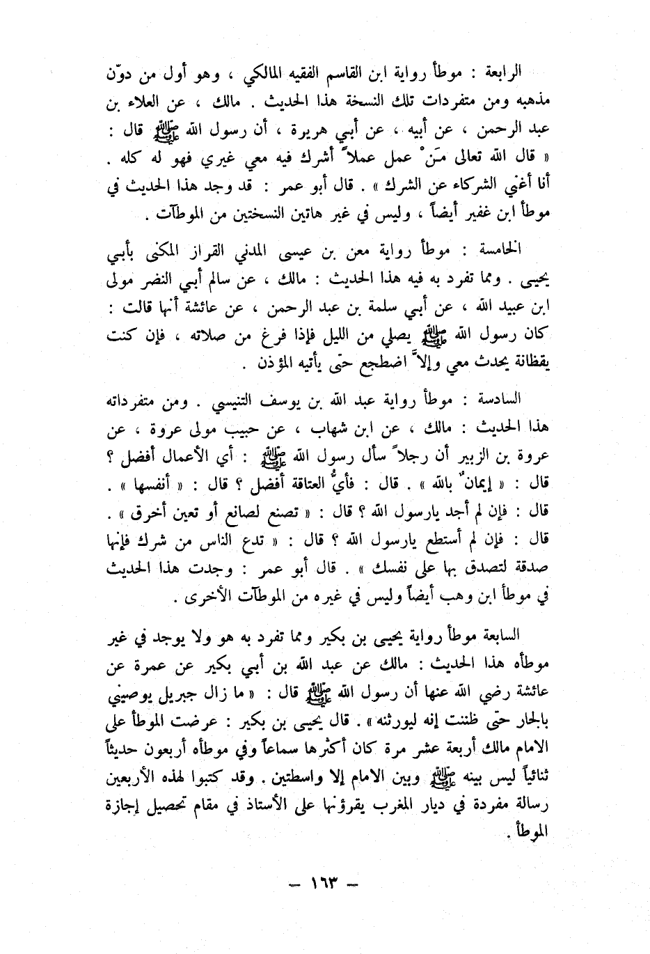 الرَّابِعَة موطأ رِوَايَة ابْن الْقَاسِم الْفَقِيه الْمَالِكِي وَهُوَ أول من دون مذْهبه وَمن متفردات تِلْكَ النُّسْخَة هَذَا الحَدِيث مَالك عَن الْعَلَاء بن عبد الرَّحْمَن عَن أَبِيه عَن أبي هُرَيْرَة أَن رَسُول الله صلى الله عَلَيْهِ وَسلم قَالَ قَالَ الله تَعَالَى من عمل عملا أشرك فِيهِ معي غَيْرِي فَهُوَ لَهُ كُله أَنا أُغني الشُّرَكَاء عَن الشّرك قَالَ أَبُو عمر قد وجدنَا هَذَا الحَدِيث فِي موطأ ابْن غفير أَيْضا وَلَيْسَ فِي غير هَاتين النسختين من الموطات