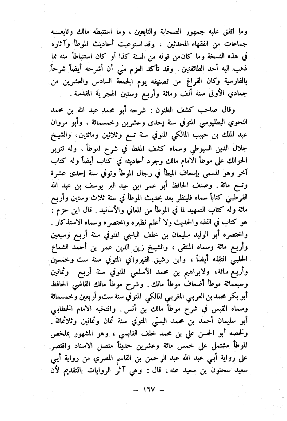 وَقَالَ صَاحب كشف الظنون شَرحه أَبُو مُحَمَّد عبد الله بن مُحَمَّد النَّحْوِيّ البطليوسي المتوفي سنة إِحْدَى وَعشْرين وَخَمْسمِائة وأبومروان عبد الْملك بن حبيب الْمَالِكِي المتوفي سنة تسع وَثَلَاثِينَ وَمِائَتَيْنِ وَالشَّيْخ جلال الدّين السُّيُوطِيّ وَسَماهُ كشف المغطا فِي شرح الْمُوَطَّأ وَله تنوير الحوالك على موطأ الإِمَام مَالك وجرد أَحَادِيثه فِي كتاب أَيْضا وَله كتاب آخر وَهُوَ الْمُسَمّى بإسعاف المبطأ فِي رجال الْمُوَطَّأ وَتُوفِّي سنة إِحْدَى عشرَة وتسع مائَة وصنف الْحَافِظ أَبُو عمر ابْن عبد الْبر يُوسُف بن عبد الله الْقُرْطُبِيّ كتابا سَمَّاهُ فَلْينْظر بعد بِحَدِيث الْمُوَطَّأ فِي سنة ثَلَاث وَسِتِّينَ وَأَرْبع مائَة وَله كتاب التَّمْهِيد لما فِي الْمُوَطَّأ من الْمعَانِي والأسانيد قَالَ ابْن حزم هُوَ كتاب فِي الْفِقْه والْحَدِيث وَلَا أعلم نَظِيره وَاخْتَصَرَهُ وَسَماهُ الاستذكار وَاخْتَصَرَهُ أبوالوليد سُلَيْمَان بن خلف الْبَاجِيّ المتوفي سنة أَربع وَسبعين وَأَرْبع مائَة وَسَماهُ الْمُنْتَقى وَالشَّيْخ زين الدّين عمر بن أَحْمد الشماع الْحلَبِي انتقله أَيْضا وَابْن رَشِيق القيرواني المتوفي سنة سِتّ وَخمسين وَأَرْبع مائَة ولإبراهيم بن مُحَمَّد الْأَسْلَمِيّ المتوفي سنة أَربع وَثَمَانِينَ وَسَبْعمائة موطأ أَضْعَاف موطأ مَالك وَشرح موطأ مَالك القَاضِي الْحَافِظ أَبُو بكر مُحَمَّد بن الْعَرَبِيّ المغربي الْمَالِكِي المتوفي سنة سِتّ وَأَرْبَعين وَخَمْسمِائة وَسَماهُ القبس فِي شرح موطأ مَالك بن أنس وانتخبه الإِمَام الْخطابِيّ أَبُو سُلَيْمَان أَحْمد بن مُحَمَّد البستي المتوفي سنة ثَمَان وَثَمَانِينَ وثلاثمائة ولخصه أَبُو الْحسن عَليّ بن مُحَمَّد خلف الْقَابِسِيّ وَهُوَ الْمَشْهُور بملخص الْمُوَطَّأ مُشْتَمل على خمس مائَة وَعشْرين حَدِيثا مُتَّصِل الْإِسْنَاد وَاقْتصر على رِوَايَة أبي عبد الله عبد الرَّحْمَن بن الْقَاسِم الْمصْرِيّ من رِوَايَة أبي سعيد سَحْنُون بن سعيد عَنهُ قَالَ وَهِي آثر الرِّوَايَات بالتقديم لِأَن