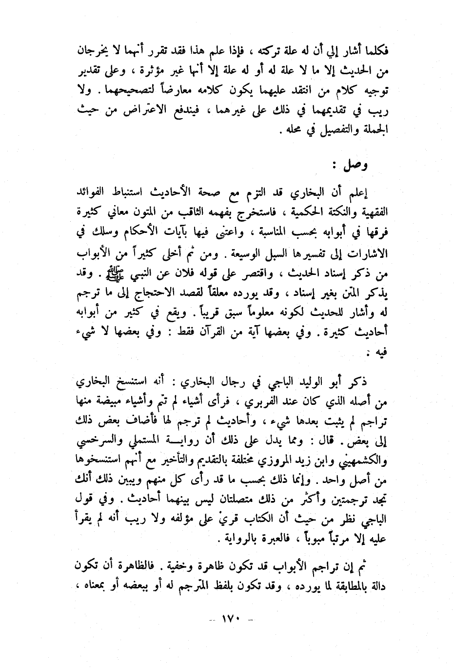 ذكر أَبُو الْوَلِيد الْبَاجِيّ فِي رجال البُخَارِيّ أَنه استنسخ البُخَارِيّ من أَصله الَّذِي كَانَ عِنْد الْفربرِي فَرَأى أَشْيَاء لم تتمّ وَأَشْيَاء مبيضة مِنْهَا تراجم لم يثبت بعْدهَا شَيْء وَأَحَادِيث لم ترْجم لَهَا فأضاف بعض ذَلِك إِلَى بعض قَالَ وَمِمَّا يدل على ذَلِك أَن رِوَايَة الْمُسْتَمْلِي والسرخسي والكشمهيني وَابْن زيد الْمروزِي مُخْتَلفَة بالتقديم وَالتَّأْخِير مَعَ أَنهم استنسخوها من أصل وَاحِد وَإِنَّمَا ذَلِك بِحَسب مَا قد رأى كل مِنْهُم وَيبين ذَلِك أَنَّك تَجِد ترجمتين وَأكْثر من ذَلِك متصلتان لَيْسَ بَينهمَا أَحَادِيث وَفِي قَول الْبَاجِيّ نظر من حَيْثُ أَن الْكتاب قري على مُؤَلفه وَلَا ريب أَنه لم يقْرَأ عَلَيْهِ إِلَّا مُرَتبا مبوبا فَالْعِبْرَة بالرواية