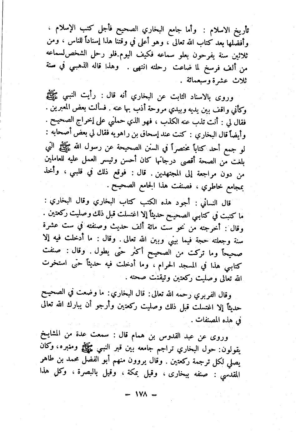 وَقَالَ الْفربرِي رَحمَه الله تَعَالَى قَالَ البُخَارِيّ مَا وضعت فِي الصَّحِيح حَدِيثا إِلَّا اغْتَسَلت قبل ذَلِك وَصليت رَكْعَتَيْنِ وَأَرْجُو أَن يُبَارك الله تَعَالَى فِي هَذِه المصنفات