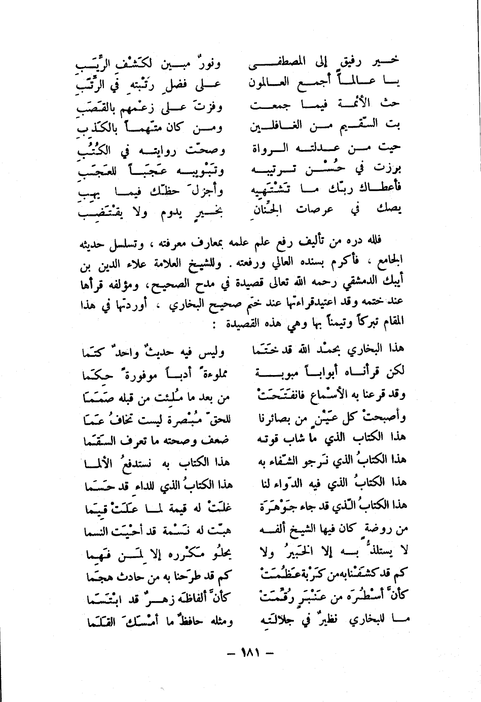 فَللَّه دره من تأليف رفع علم علمه بمعارف مَعْرفَته وتسلسل حَدِيثه الْجَامِع فَأكْرم بِسَنَدِهِ العالي ورفعته وللشيخ الْعَلامَة عَلَاء الدّين بن أيبك الدِّمَشْقِي رَحمَه الله تَعَالَى قصيدة فِي مدح الصَّحِيح ومؤلفه قَرَأَهَا عِنْد خَتمه وَقد اُعْتِيدَ قرَاءَتهَا عِنْد ختم صَحِيح البُخَارِيّ أوردتها فِي هَذَا الْمقَام تبركا وتيمنا بهَا وَهِي هَذِه القصيدة