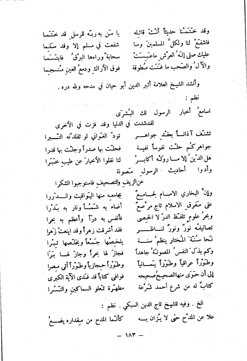 (والآل والصحب مَا غنت مطوقة ... فَوق الْأَرَاك ودمع الْعين منسجما) وَأنْشد الشَّيْخ الْعَلامَة أثير الدّين أَبُو حَيَّان فِي مدحه وَللَّه دره نظم