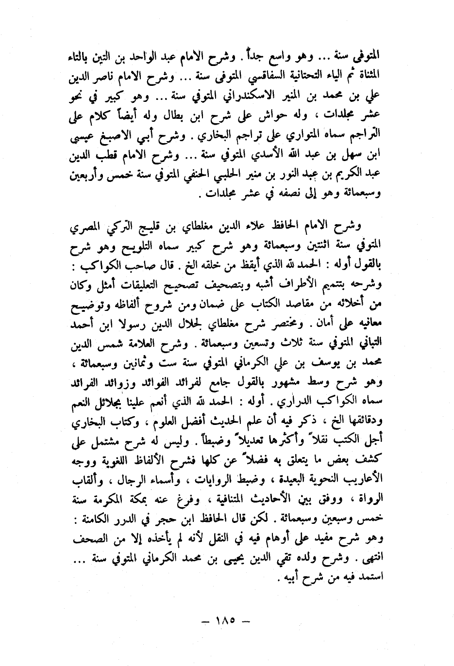 وَشرح الإِمَام الْحَافِظ عَلَاء الدّين مغلطاي بن قليج التركي الْمصْرِيّ المتوفي سنة اثْنَتَيْنِ وَسَبْعمائة وَهُوَ شرح كَبِير سَمَّاهُ التَّلْوِيح وَهُوَ شرح بالْقَوْل أَوله الْحَمد لله الَّذِي أيقظ من خلقه الخ قَالَ صَاحب الْكَوَاكِب وَشَرحه بتتميم الْأَطْرَاف أشبه وبتصحيف تَصْحِيح التعليقات أمثل وَكَانَ من أخلائه من مَقَاصِد الْكتاب على ضَمَان وَمن شُرُوح أَلْفَاظه وتوضيح مَعَانِيه على أَمَان ومختصر شرح مغلطاي لجلال الدّين رَسُولا ابْن أَحْمد التباني المتوفي سنة ثَلَاث وَتِسْعين وَسَبْعمائة وَشرح الْعَلامَة شمس الدّين مُحَمَّد بن يُوسُف بن عَليّ الْكرْمَانِي المتوفي سنة سِتّ وَثَمَانِينَ وَسَبْعمائة وَهُوَ شرح وسط مَشْهُور بالْقَوْل جَامع لفرائد الْفَوَائِد وزوائد الفرائد سَمَّاهُ الْكَوَاكِب الدراري أَوله الْحَمد لله الَّذِي أنعم علينا بجلائل النعم ودقائقها الخ ذكر فِيهِ أَن علم الحَدِيث أفضل الْعُلُوم وَكتاب البُخَارِيّ أجل الْكتب نقلا وأكثرها تعديلا وضبطا وَلَيْسَ لَهُ شرح مُشْتَمل على كشف بعض مَا يتَعَلَّق بِهِ فضلا عَن كلهَا فشرح الْأَلْفَاظ اللُّغَوِيَّة وَوجه الأعاريب النحوية الْبَعِيدَة وَضبط الرِّوَايَات وَأَسْمَاء الرِّجَال وألقاب الروَاة ووفق بَين الْأَحَادِيث المتنافية وَفرغ عَنهُ بِمَكَّة المكرمة سنة خمس وَسبعين وَسَبْعمائة لَكِن قَالَ الْحَافِظ ابْن حجر فِي الدُّرَر الكامنة وَهُوَ شرح مُفِيد على أَوْهَام فِيهِ فِي النَّقْل لِأَنَّهُ لم يَأْخُذهُ إِلَّا من الصُّحُف انْتهى وَشرح وَلَده تَقِيّ الدّين يحيى بن مُحَمَّد الْكرْمَانِي المتوفي سنة استمد فِيهِ من شرح أَبِيه