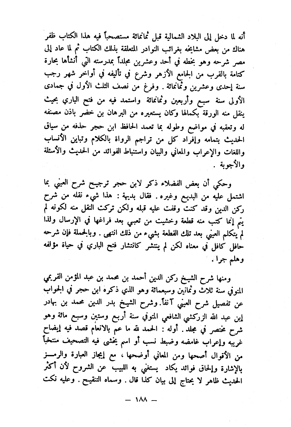 وَحكي أَن بعض الْفُضَلَاء ذكر لِابْنِ حجر تَرْجِيح شرح الْعَيْنِيّ بِمَا اشْتَمَل عَلَيْهِ من البديع وَغَيره فَقَالَ بديهة هَذَا شَيْء نَقله من شرح ركن الدّين وَقد كنت وقفت عَلَيْهِ قبله وَلَكِن تركت النَّقْل مِنْهُ لكَونه لم يتم إِنَّمَا كتب مِنْهُ قِطْعَة وخشيت من تعبي بعد فراغها فِي الْإِرْسَال وَلذَا لم يتَكَلَّم الْعَيْنِيّ بعد تِلْكَ الْقطعَة بِشَيْء من ذَلِك انْتهى وَبِالْجُمْلَةِ فَإِن شَرحه حافل كافل فِي مَعْنَاهُ لَكِن لم ينتشر كانتشار فتح الْبَارِي فِي حَيَاة مُؤَلفه وهلم جرا
