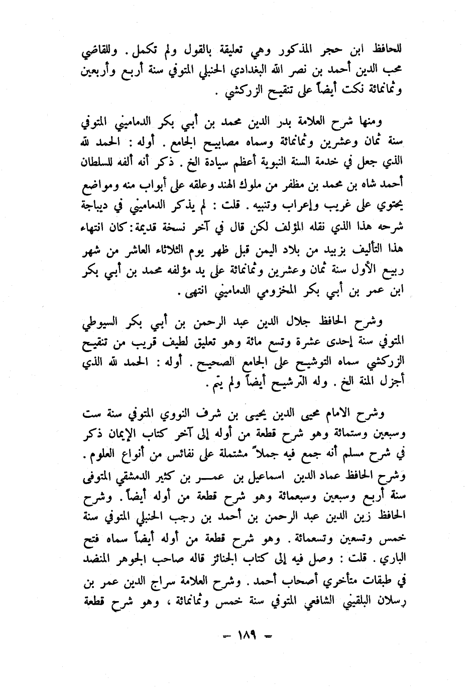 وَشرح الإِمَام محيي الدّين يحيى بن شرف النَّوَوِيّ المتوفي سنة سِتّ وَسبعين وسِتمِائَة وَهُوَ شرح قِطْعَة من أول إِلَى آخر كتاب الْإِيمَان ذكر فِي شرح مُسلم أَنه جمع فِيهِ جملا مُشْتَمِلَة على نفائس من أَنْوَاع الْعُلُوم وَشرح الْحَافِظ عماد الدّين اسماعيل بن عمر بن كثير الدِّمَشْقِي الْمُتَوفَّى سنة أَربع وَسبعين وَسَبْعمائة وَهُوَ شرح قِطْعَة من أَوله أَيْضا وَشرح الْحَافِظ زين الدّين عبد الرَّحْمَن بن أَحْمد بن رَجَب الْحَنْبَلِيّ المتوفي سنة خمس وَتِسْعين وَتِسْعمِائَة وَهُوَ شرح قِطْعَة من أَوله أَيْضا سَمَّاهُ فتح الْبَارِي قلت وصل فِيهِ إِلَى كتاب الْجَنَائِز قَالَه صَاحب الْجَوْهَر المنضد فِي طَبَقَات متأخري أَصْحَاب أَحْمد وَشرح الْعَلامَة سراج الدّين عمر بن رسْلَان البُلْقِينِيّ الشَّافِعِي المتوفي سنة خمس وَثَمَانمِائَة وَهُوَ شرح قِطْعَة