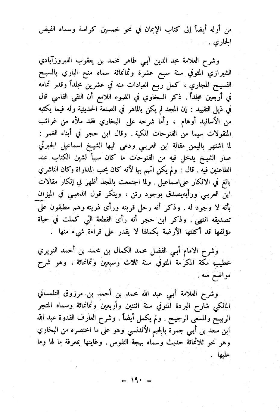 وَشرح الْعَلامَة مجد الدّين أبي طَاهِر مُحَمَّد بن يَعْقُوب الفيروزآبادي الشِّيرَازِيّ المتوفي سنة سبع عشرَة وَثَمَانمِائَة سَمَّاهُ منح الْبَارِي بالسيح الفسيح المجاري كَمَا ربع الْعِبَادَات مِنْهُ فِي عشْرين مجلدا وَقدر تَمَامه فِي أَرْبَعِينَ مجلدا ذكر السخاوي فِي الضَّوْء اللامع أَن التقى الفاسي قَالَ فِي ذيل التَّقْيِيد إِن الْمجد لم يكن بالماهر فِي الصَّنْعَة الحديثية وَله فِيمَا يَكْتُبهُ من الْأَسَانِيد أَوْهَام وَأما شَرحه على البُخَارِيّ فقد ملأَهُ من غرائب المنقولات سِيمَا من الفتوحات المكية وَقَالَ ابْن حجر فِي أَبنَاء الْغمر لما اشْتهر بِالْيمن مقَالَة ابْن الْعَرَبِيّ ودعى إِلَيْهَا الشَّيْخ اسماعيل الجبرتي صَار الشَّيْخ يدْخل فِيهِ من الفتوحات مَا كَانَ سَببا لشين الْكتاب عِنْد الطاعنين فِيهِ قَالَ وَلم يكن اتهمَ بهَا لِأَنَّهُ كَانَ يحب المداراة وَكَانَ النَّاشِرِيّ بَالغ فِي الانكار على اسماعيل وَلما اجْتمعت بالمجد أظهر لي إِنْكَار مقالات ابْن الْعَرَبِيّ ورأيه يصدق بِوُجُود رتن وينكر قَول الذَّهَبِيّ فِي الْمِيزَان بِأَنَّهُ لَا وجود لَهُ وَذكر أَنه رَحل قريته ورى ذُريَّته وهم مطبقون على تَصْدِيقه انْتهى وَذكر ابْن حجر أَنه رأى الْقطعَة الَّتِي كملت فِي حَيَاة مؤلفها قد أكلتها الأرضة بكمالها لَا يقدر على قِرَاءَة شَيْء مِنْهَا