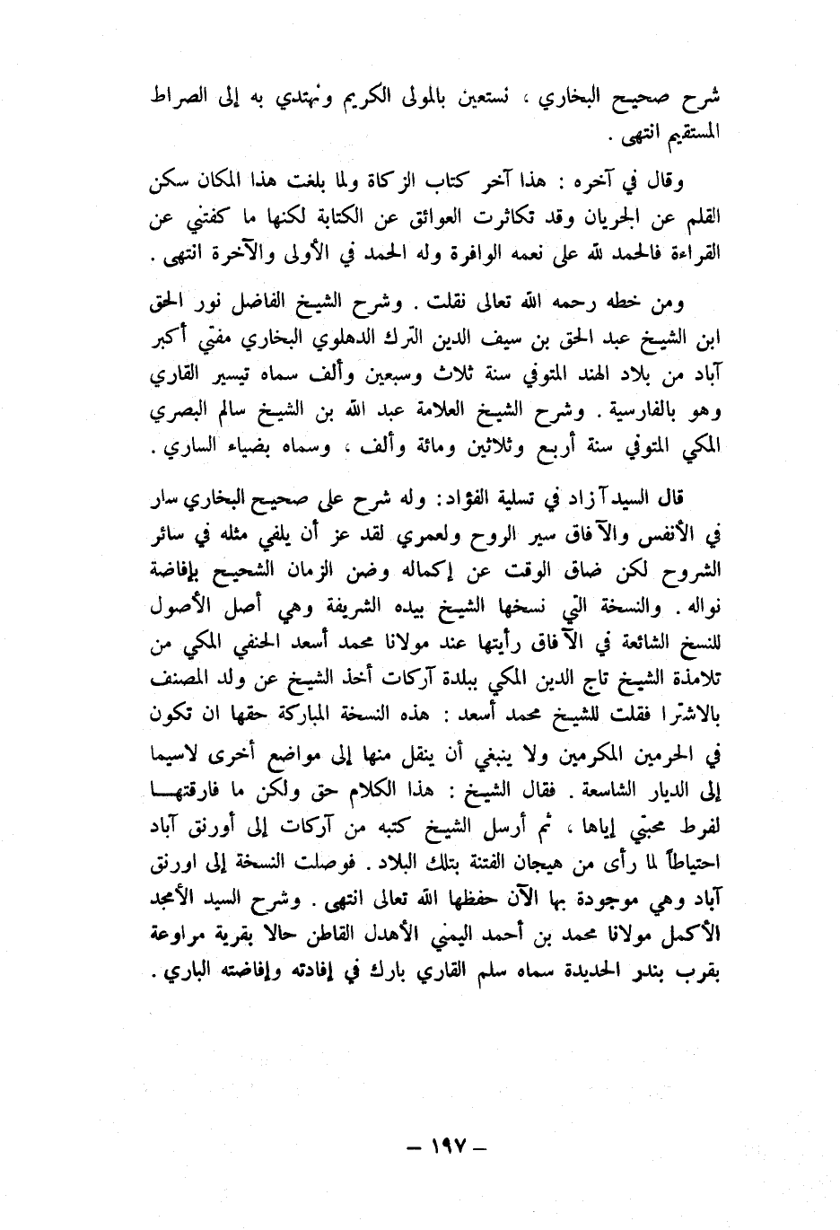 وَمن خطه رَحمَه الله تَعَالَى نقلت وَشرح الشَّيْخ الْفَاضِل نور الْحق ابْن الشَّيْخ عبد الْحق بن سيف الدّين التّرْك الدهلوي البُخَارِيّ مفتي أكبر آباد من بِلَاد الْهِنْد المتوفي سنة ثَلَاث وَسبعين وَألف سَمَّاهُ تيسير الْقَارِي وَهُوَ بِالْفَارِسِيَّةِ وَشرح الشَّيْخ الْعَلامَة عبد الله بن الشَّيْخ سَالم الْبَصْرِيّ الْمَكِّيّ المتوفي سنة أَربع وَثَلَاثِينَ وَمِائَة وَألف وَسَماهُ بضياء الساري