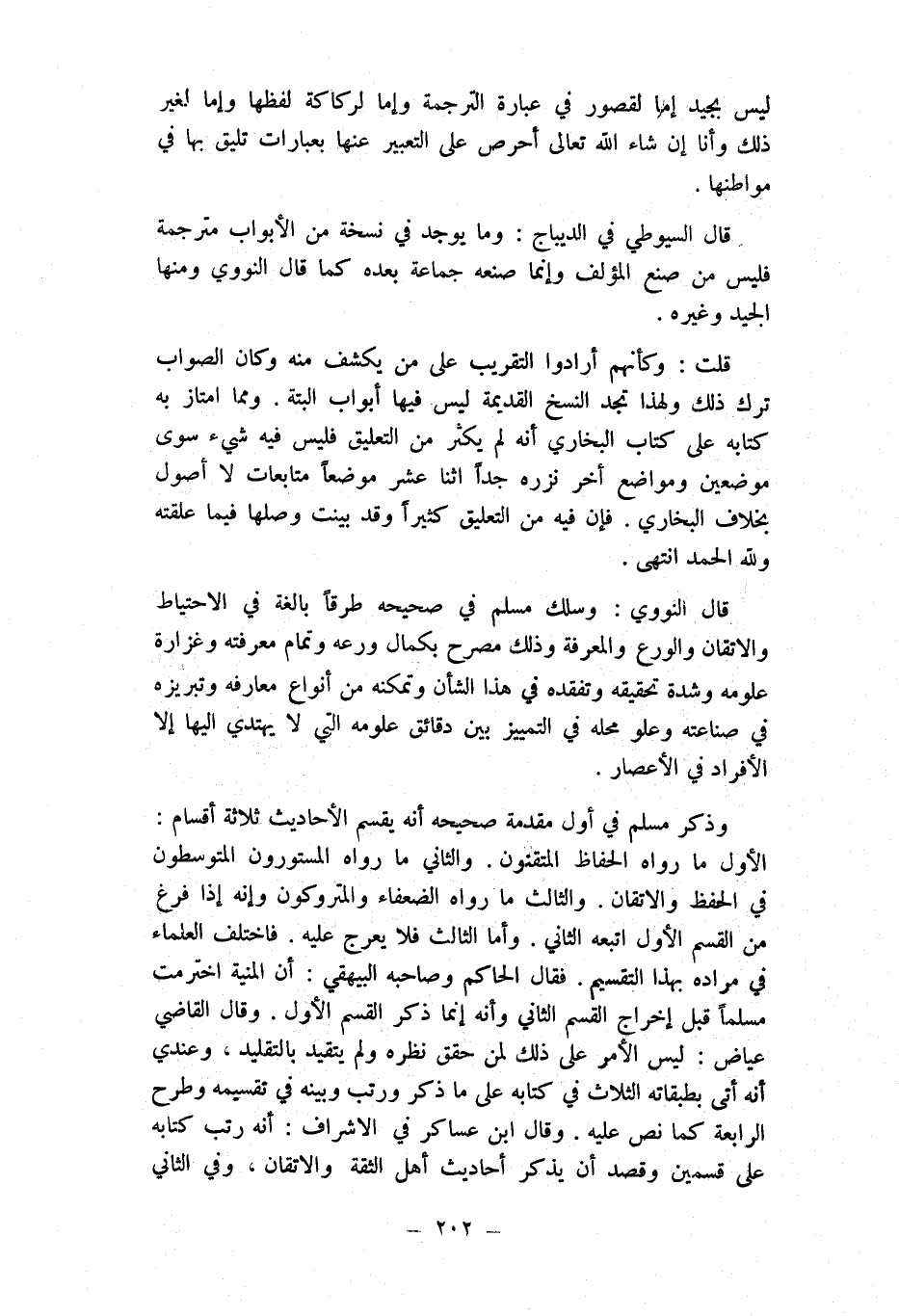 وَذكر مُسلم فِي أول مُقَدّمَة صَحِيحه أَنه يقسم الْأَحَادِيث ثَلَاثَة أَقسَام الأول مَا رَوَاهُ الْحفاظ المتقنون وَالثَّانِي مَا رَوَاهُ المستورون المتوسطون فِي الْحِفْظ والإتقان وَالثَّالِث مَا رَوَاهُ الضُّعَفَاء والمتروكون وَإنَّهُ إِذا فرغ من الْقسم الأول اتبعهُ الثَّانِي وَأما الثَّالِث فَلَا يعرج عَلَيْهِ فَاخْتلف الْعلمَاء فِي مُرَاده بِهَذَا التَّقْسِيم فَقَالَ الْحَاكِم وَصَاحبه الْبَيْهَقِيّ أَن الْمنية اخترمت مُسلما قبل إِخْرَاج الْقسم الثَّانِي وَأَنه إِنَّمَا ذكر الْقسم الأول وَقَالَ القَاضِي عِيَاض لَيْسَ الْأَمر على ذَلِك لمن حقق نظره وَلم يتَقَيَّد بالتقليد وَعِنْدِي أَنه أَتَى بطبقاته الثَّلَاث فِي كِتَابه على مَا ذكر ورتب وَبَينه فِي تقسيمه وَطرح الرَّابِعَة كَمَا نَص عَلَيْهِ وَقَالَ ابْن عَسَاكِر فِي الْأَشْرَاف أَنه رتب كِتَابه على قسمَيْنِ وَقصد أَن يذكر أَحَادِيث أهل الثِّقَة والإتقان وَفِي الثَّانِي