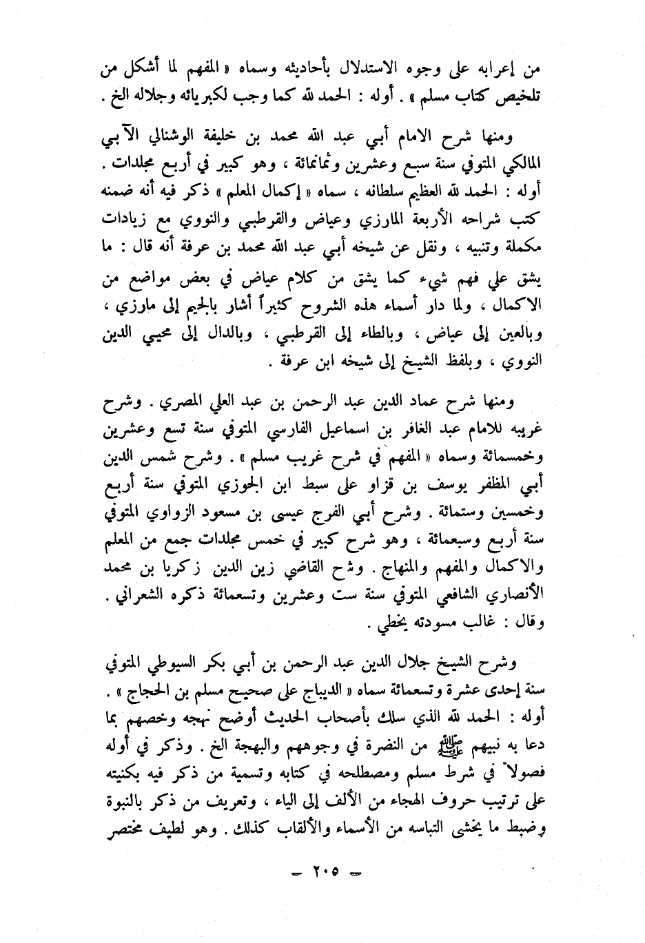 وَمِنْهَا شرح عماد الدّين عبد الرَّحْمَن بن عبد الْعلي الْمصْرِيّ وَشرح غَرِيبه للْإِمَام عبد الغافر بن اسماعيل الْفَارِسِي المتوفي سنة تسع وَعشْرين وَخَمْسمِائة وَسَماهُ الْمُفْهم فِي شرح غَرِيب مُسلم وَشرح شمس الدّين أبي المظفر يُوسُف بن قزاو على سبط ابْن الْجَوْزِيّ المتوفي سنة أَربع وَخمسين وسِتمِائَة وَشرح أبي الْفرج عِيسَى بن مَسْعُود الزواوي المتوفي سنة أَربع وَسَبْعمائة وَهُوَ شرح كَبِير فِي خمس مجلدات جمع من الْمعلم والإكمال والمفهم والمنهاج وَشرح القَاضِي زين الدّين زَكَرِيَّا بن مُحَمَّد الْأنْصَارِيّ الشَّافِعِي المتوفي سنة سِتّ وَعشْرين وَتِسْعمِائَة ذكره الشعراني وَقَالَ غَالب مسودته يخطي