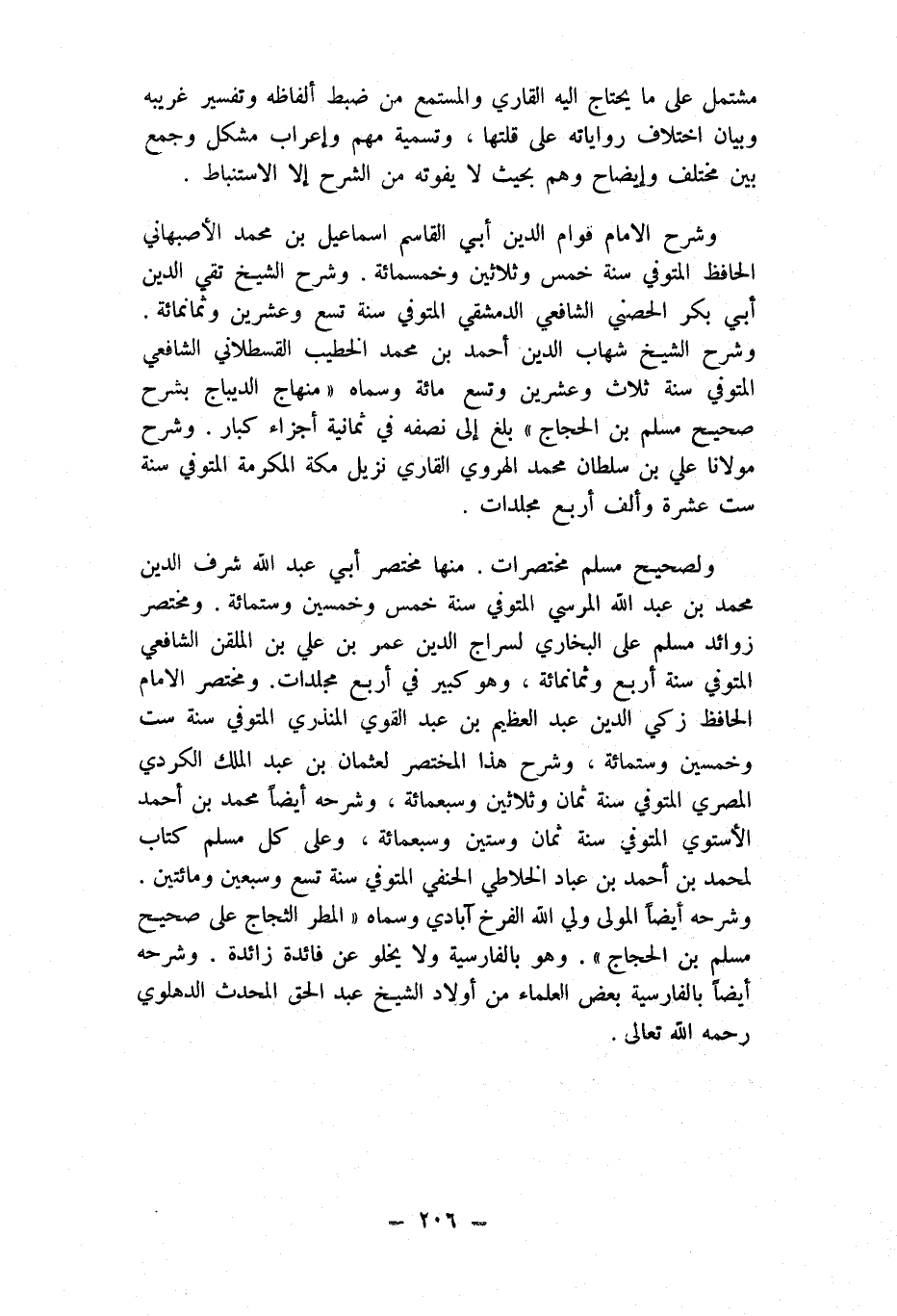 ولصحيح مُسلم مختصرات مِنْهَا مُخْتَصر أبي عبد الله شرف الدّين مُحَمَّد بن عبد الله المرسي المتوفي سنة خمس وَخمسين وسِتمِائَة ومختصر زَوَائِد مُسلم على البُخَارِيّ لسراج الدّين عمر بن عَليّ بن الملقن الشَّافِعِي المتوفي سنة أَربع وَثَمَانمِائَة وَهُوَ كَبِير فِي أَربع مجلدات ومختصر الإِمَام الْحَافِظ زكي الدّين عبد العظيم بن عبد الْقوي الْمُنْذِرِيّ المتوفي سنة سِتّ وَخمسين وسِتمِائَة وَشرح هَذَا الْمُخْتَصر لعُثْمَان بن عبد الْملك الْكرْدِي الْمصْرِيّ المتوفي سنة ثَمَان وَثَلَاثِينَ وَسَبْعمائة وَشَرحه أَيْضا مُحَمَّد بن أَحْمد الأستوي المتوفي سنة ثَمَان وَسِتِّينَ وَسَبْعمائة وعَلى كل مُسلم كتاب لمُحَمد بن أَحْمد بن عباد الخلاطي الْحَنَفِيّ المتوفي سنة تسع وَسبعين وَمِائَتَيْنِ وَشَرحه أَيْضا الْمولى ولي الله الفرخ آبادي وَسَماهُ الْمَطَر الثجاج على صَحِيح مُسلم بن الْحجَّاج وَهُوَ بِالْفَارِسِيَّةِ وَلَا يَخْلُو عَن فَائِدَة زَائِدَة وَشَرحه أَيْضا بِالْفَارِسِيَّةِ بعض الْعلمَاء من أَوْلَاد الشَّيْخ عبد الْحق الْمُحدث الدهلوي رَحمَه الله تَعَالَى