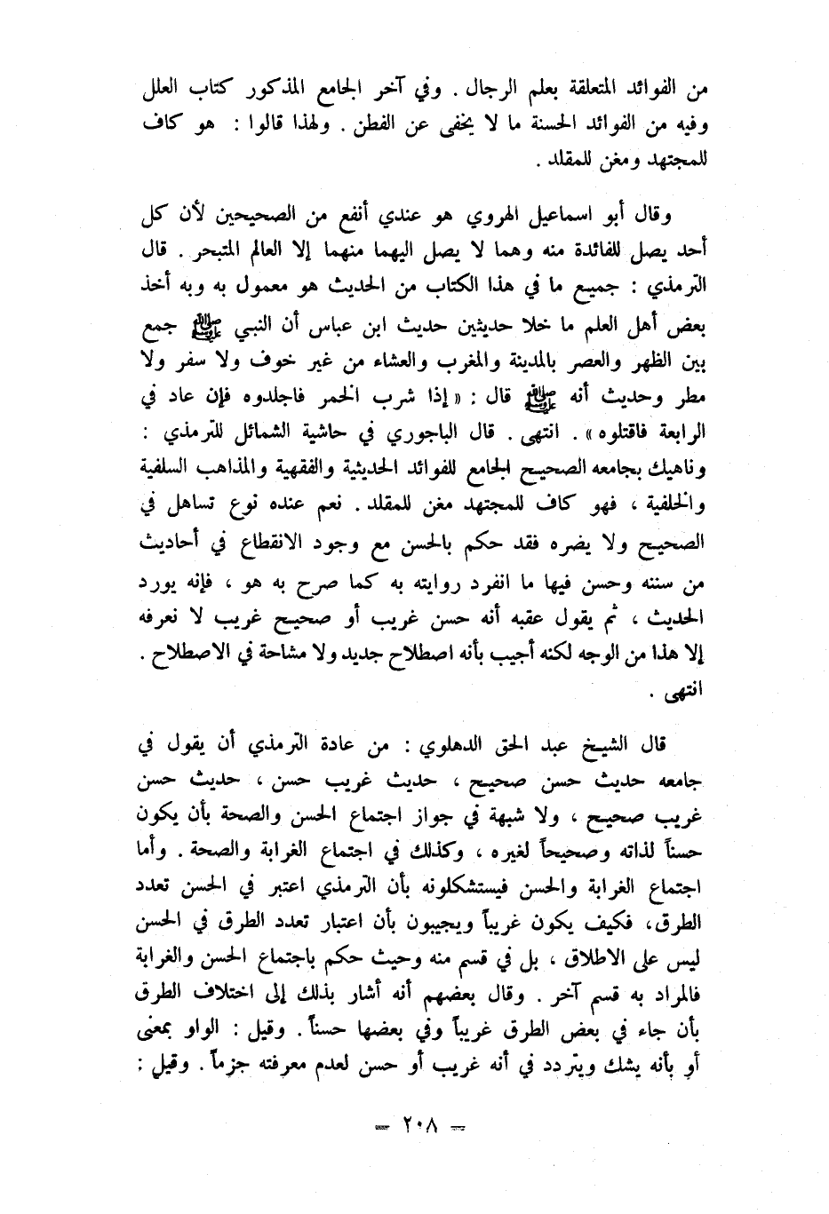 وَقَالَ أَبُو اسماعيل الْهَرَوِيّ هُوَ عِنْدِي أَنْفَع من الصَّحِيحَيْنِ لِأَن كل أحد يصل للفائدة مِنْهُ وهما لَا يصل إِلَيْهِمَا مِنْهُمَا إِلَّا الْعَالم المتبحر قَالَ التِّرْمِذِيّ جَمِيع مَا فِي هَذَا الْكتاب من الحَدِيث هُوَ مَعْمُول بِهِ وَبِه أَخذ بعض أهل الْعلم مَا خلا حديثين حَدِيث ابْن عَبَّاس أَن النَّبِي صلى الله عَلَيْهِ وَسلم جمع بَين الظّهْر وَالْعصر بِالْمَدِينَةِ وَالْمغْرب وَالْعشَاء من غير خوف وَلَا سفر وَلَا مطر وَحَدِيث أَنه صلى الله عَلَيْهِ وَسلم قَالَ إِذا شرب الْخمر فاجلدوه فَإِن عَاد فِي الرَّابِعَة فَاقْتُلُوهُ انْتهى قَالَ الباجوري فِي حَاشِيَة الشَّمَائِل لِلتِّرْمِذِي وناهيك بجامعه الصَّحِيح الْجَامِع للفوائد الحديثية والفقهية والمذاهب السلفية والخلفية فَهُوَ كَاف للمجتهد مغن للمقلد نعم عِنْده نوع تساهل فِي الصَّحِيح وَلَا يضرّهُ فقد حكم بالْحسنِ مَعَ وجود الِانْقِطَاع فِي أَحَادِيث من سنَنه وَحسن فِيهَا مَا انْفَرد رِوَايَته بِهِ كَمَا صرح بِهِ هُوَ فَإِنَّهُ يُورد الحَدِيث ثمَّ يَقُول عقبه أَنه حسن غَرِيب أَو صَحِيح غَرِيب لَا نعرفه إِلَّا هَذَا من الْوَجْه لكنه أُجِيب بِأَنَّهُ اصْطِلَاح جَدِيد وَلَا مشاحة فِي الِاصْطِلَاح انْتهى