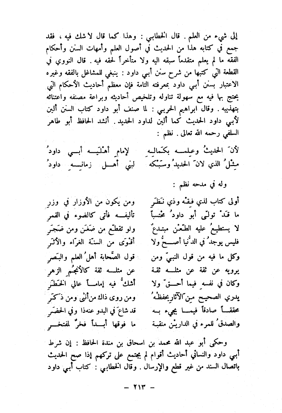 إِلَى شَيْء من الْعلم قَالَ الْخطابِيّ وَهَذَا كَمَا قَالَ لَا شكّ فِيهِ فقد جمع فِي كِتَابه هَذَا من الحَدِيث فِي أصُول الْعلم وَأُمَّهَات السّنَن وَأَحْكَام الْفِقْه مالم يعلم مُتَقَدما سبقه إِلَيْهِ وَلَا مُتَأَخِّرًا لحقه فِيهِ قَالَ النَّوَوِيّ فِي الْقطعَة الَّتِي كتبهَا من شرح سنَن أبي دَاوُد يَنْبَغِي للمشاغل بالفقه وَغَيره الِاعْتِبَار بسنن أبي دَاوُد بمعرفته التَّامَّة فَإِن مُعظم أَحَادِيث الْأَحْكَام الَّتِي يحْتَج بهَا فِيهِ مَعَ سهولة تنَاوله وتلخيص أَحَادِيثه وبراعة مُصَنفه واعتنائه بتهذيبه وَقَالَ إِبْرَاهِيم الْحَرْبِيّ لما صنف أَبُو دَاوُد كتاب السّنَن أَلين لأبي دَاوُد الحَدِيث كَمَا أَلين لداود الْحَدِيد أنْشد الْحَافِظ أَبُو طَاهِر السلَفِي رَحمَه الله تَعَالَى نظم