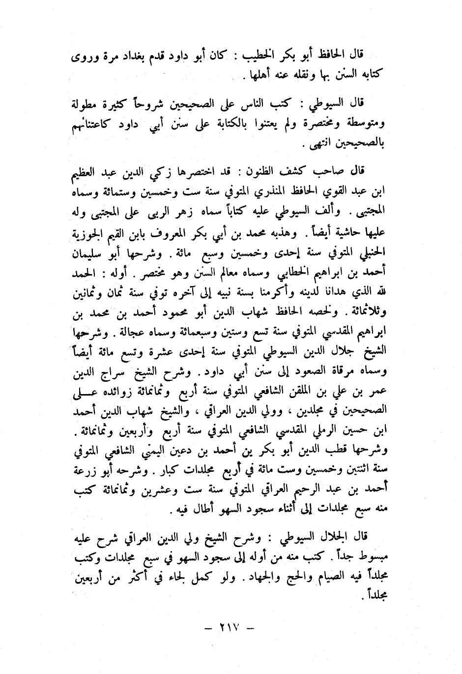 قَالَ صَاحب كشف الظنون قد اختصرها زكي الدّين عبد الْعَظِيم ابْن عبد الْقوي الْحَافِظ الْمُنْذِرِيّ المتوفي سنة سِتّ وَخمسين وسِتمِائَة وَسَماهُ الْمُجْتَبى وَألف السُّيُوطِيّ عَلَيْهِ كتابا سَمَّاهُ زهر الربى على الْمُجْتَبى وَله عَلَيْهَا حَاشِيَة أَيْضا وهذبه مُحَمَّد بن أبي بكر الْمَعْرُوف بِابْن الْقيم الجوزية الْحَنْبَلِيّ المتوفي سنة إِحْدَى وَخمسين وَسبع مائَة وَشَرحهَا أَبُو سُلَيْمَان أَحْمد بن إِبْرَاهِيم الْخطابِيّ وَسَماهُ معالم السّنَن وَهُوَ مُخْتَصر أَوله الْحَمد لله الَّذِي هدَانَا لدينِهِ وَأَكْرمنَا بِسنة نبيه إِلَى آخِره توفّي سنة ثَمَان وَثَمَانِينَ وثلاثمائة ولخصه الْحَافِظ شهَاب الدّين أَبُو مَحْمُود أَحْمد بن مُحَمَّد بن إِبْرَاهِيم الْمَقْدِسِي المتوفي سنة تسع وَسِتِّينَ وَسَبْعمائة وَسَماهُ عجالة وَشَرحهَا الشَّيْخ جلال الدّين السُّيُوطِيّ المتوفي سنة إِحْدَى عشرَة وتسع مائَة أَيْضا وَسَماهُ مرقاة الصعُود إِلَى سنَن أبي دَاوُد وَشرح الشَّيْخ سراج الدّين عمر بن عَليّ بن الملقن الشَّافِعِي المتوفي سنة أَربع وَثَمَانمِائَة زوائده على الصَّحِيحَيْنِ فِي مجلدين وَولي الدّين الْعِرَاقِيّ وَالشَّيْخ شهَاب الدّين أَحْمد ابْن حُسَيْن الرَّمْلِيّ الْمَقْدِسِي الشَّافِعِي المتوفي سنة أَربع وَأَرْبَعين وَثَمَانمِائَة وَشَرحهَا قطب الدّين أَبُو بكر بن أَحْمد بن دعين اليمني الشَّافِعِي المتوفي سنة اثْنَتَيْنِ وَخمسين وست مائَة فِي أَربع مجلدات كبار وَشَرحه أَبُو زرْعَة أَحْمد بن عبد الرَّحِيم الْعِرَاقِيّ المتوفي سنة سِتّ وَعشْرين وَثَمَانمِائَة كتب مِنْهُ سبع مجلدات إِلَى أثْنَاء سُجُود السَّهْو أَطَالَ فِيهِ