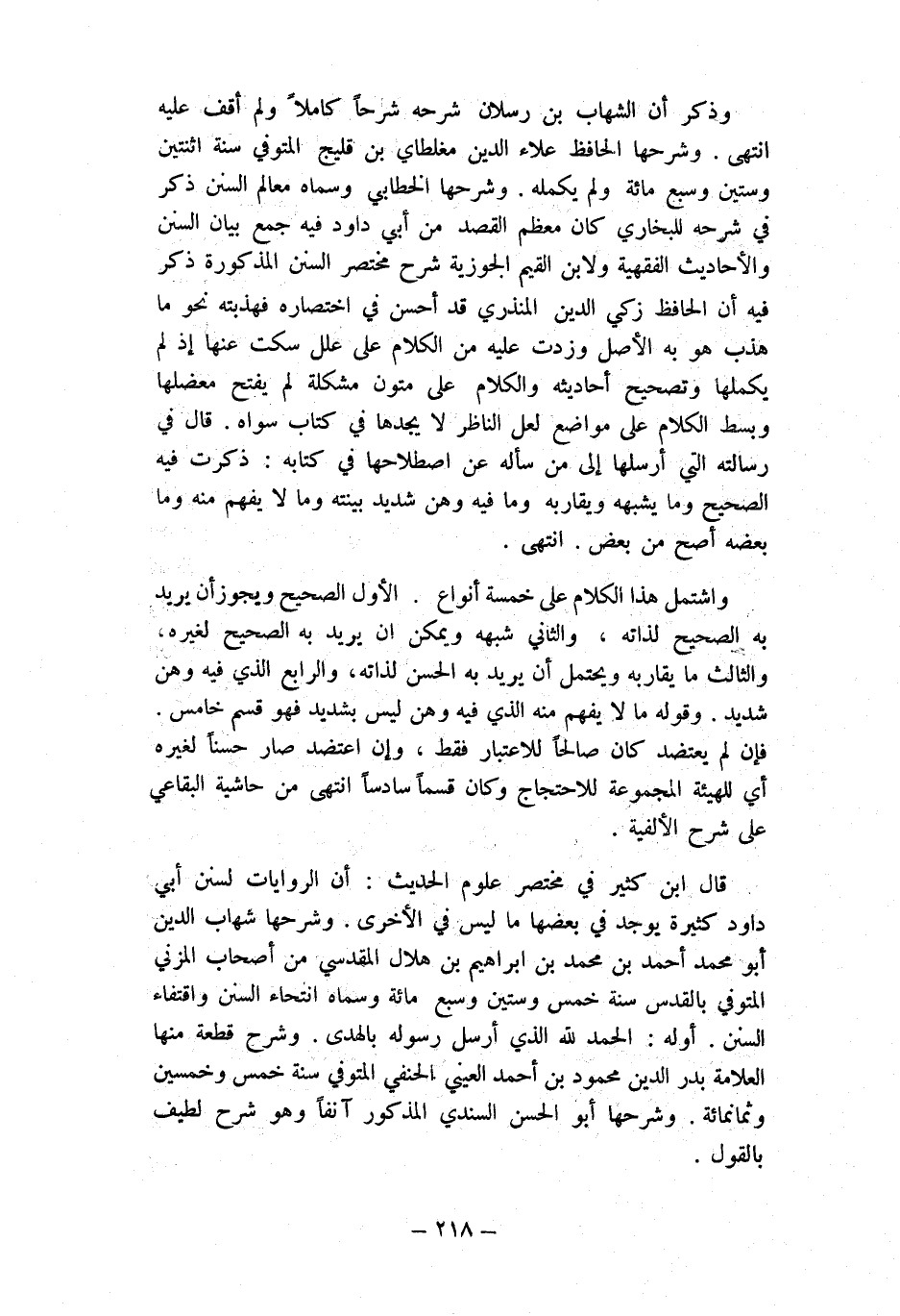 وَذكر أَن الشهَاب بن رسْلَان شَرحه شرحا كَامِلا وَلم أَقف عَلَيْهِ انْتهى وَشَرحهَا الْحَافِظ عَلَاء الدّين مغلطاي بن قليج المتوفي سنة اثْنَتَيْنِ وَسِتِّينَ وَسبع مائَة وَلم يكمله وَشَرحهَا الْخطابِيّ وَسَماهُ معالم السّنَن ذكر فِي شَرحه للْبُخَارِيّ كَانَ مُعظم الْقَصْد من أبي دَاوُد فِيهِ جمع بَيَان السّنَن وَالْأَحَادِيث الْفِقْهِيَّة وَلابْن الْقيم الجوزية شرح مُخْتَصر السّنَن الْمَذْكُورَة ذكر فِيهِ أَن الْحَافِظ زكي الدّين الْمُنْذِرِيّ قد أحسن فِي اختصاره فهذبته نَحْو مَا هذب هُوَ بِهِ الأَصْل وزدت عَلَيْهِ من الْكَلَام على علل سكت عَنْهَا إِذْ لم يكملها وَتَصْحِيح أَحَادِيثه وَالْكَلَام على متون مشكلة لم يفتح معضلها وَبسط الْكَلَام على مَوَاضِع لَعَلَّ النَّاظر لَا يجدهَا فِي كتاب سواهُ قَالَ فِي رسَالَته الَّتِي أرسلها إِلَى من سَأَلَهُ عَن اصطلاحها فِي كِتَابه ذكرت فِيهِ الصَّحِيح وَمَا يُشبههُ ويقاربه وَمَا فِيهِ وَهن شَدِيد بَينته وَمَا لَا يفهم مِنْهُ وَمَا بعضه أصح من بعض انْتهى