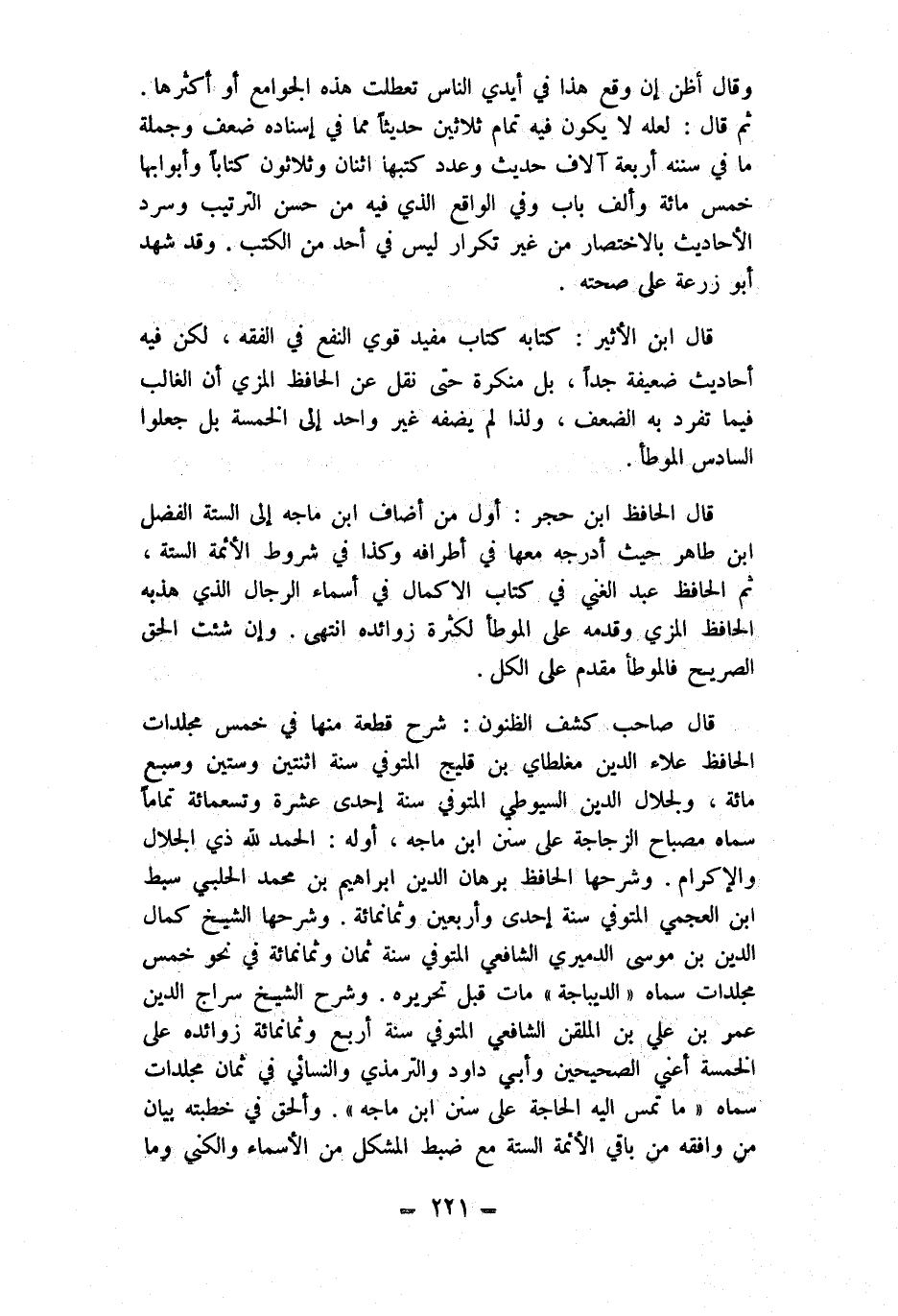 قَالَ ابْن الْأَثِير كِتَابه كتاب مُفِيد قوي النَّفْع فِي الْفِقْه لَكِن فِيهِ أَحَادِيث ضَعِيفَة جدا بل مُنكرَة حَتَّى نقل عَن الْحَافِظ الْمزي أَن الْغَالِب فِيمَا تفرد بِهِ الضعْف وَلذَا لم يضفه غير وَاحِد إِلَى الْخَمْسَة بل جعلُوا السَّادِس الْمُوَطَّأ