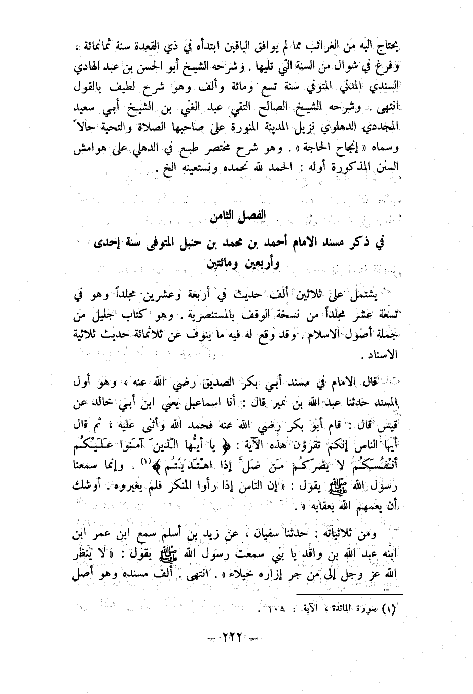 الْفَصْل الثَّامِن فِي ذكر مُسْند الإِمَام أَحْمد بن مُحَمَّد بن حَنْبَل المتوفي سنة إِحْدَى وَأَرْبَعين وَمِائَتَيْنِ