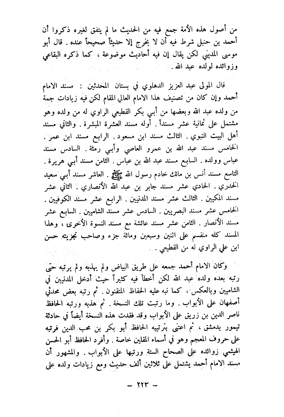 قَالَ الْمولى عبد الْعَزِيز الدهلوي فِي بُسْتَان الْمُحدثين مُسْند الإِمَام أَحْمد وَإِن كَانَ من تصنيف هَذَا الإِمَام العالي الْمقَام لَكِن فِيهِ زيادات جمة من وَلَده عبد الله وَبَعضهَا من أبي بكر الْقطيعِي الرَّاوِي لَهُ من وَلَده وَهُوَ مُشْتَمل على ثَمَانِيَة عشر مُسْندًا أَوله مُسْند الْعشْرَة المبشرة وَالثَّانِي مُسْند أهل الْبَيْت النَّبَوِيّ الثَّالِث مُسْند ابْن مَسْعُود الرَّابِع مُسْند ابْن عمر الْخَامِس مُسْند عبد الله بن عَمْرو العَاصِي وَأبي رمثة السَّادِس مُسْند عَبَّاس وَولده السَّابِع مُسْند عبد الله بن عَبَّاس الثَّامِن مُسْند أبي هُرَيْرَة التَّاسِع مُسْند أنس بن مَالك خَادِم رَسُول الله صلى الله عَلَيْهِ وَسلم الْعَاشِر مُسْند أبي سعيد الْخُدْرِيّ الْحَادِي عشر مُسْند جَابر بن عبد الله الْأنْصَارِيّ الثَّانِي عشر مُسْند المكيين الثَّالِث عشر مُسْند الْمَدَنِيين الرَّابِع عشر مُسْند الْكُوفِيّين الْخَامِس عشر مُسْند الْبَصرِيين السَّادِس عشر مُسْند الشاميين السَّابِع عشر مُسْند الْأَنْصَار الثَّامِن عشر مُسْند عَائِشَة مَعَ مُسْند النسْوَة الْأُخْرَى وَهَذَا الْمسند كُله منقسم على اثْنَيْنِ وَسبعين وَمِائَة جُزْء وَصَاحب تجزيته حسن ابْن عَليّ الرَّاوِي لَهُ من الْقطيعِي