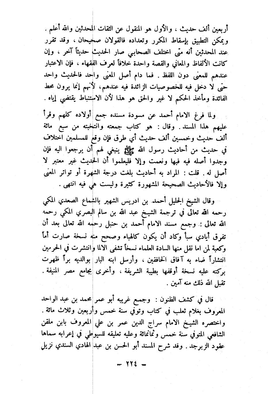 وَلما فرغ الإِمَام أَحْمد عَن مسودة مُسْنده جمع أَوْلَاده كلهم وَقَرَأَ عَلَيْهِم هَذَا الْمسند وَقَالَ هُوَ كتاب جمعته وانتخبته من سبع مائَة ألف حَدِيث وَخمسين ألف حَدِيث أَي طرق فَإِن وَقع للْمُسلمين اخْتِلَاف فِي حَدِيث من أَحَادِيث رَسُول الله صلى الله عَلَيْهِ وَسلم يَنْبَغِي لَهُم أَن يرجِعوا إِلَيْهِ فَإِن وجدوا أَصله فِيهِ فبها ونعمت وَإِلَّا فليعلموا أَن الحَدِيث غير مُعْتَبر لَا أصل لَهُ قلت المُرَاد بِهِ أَحَادِيث بلغت دَرَجَة الشُّهْرَة أَو تَوَاتر الْمَعْنى وَإِلَّا فالأحاديث الصَّحِيحَة الْمَشْهُورَة كَثِيرَة وَلَيْسَت هِيَ فِيهِ انْتهى