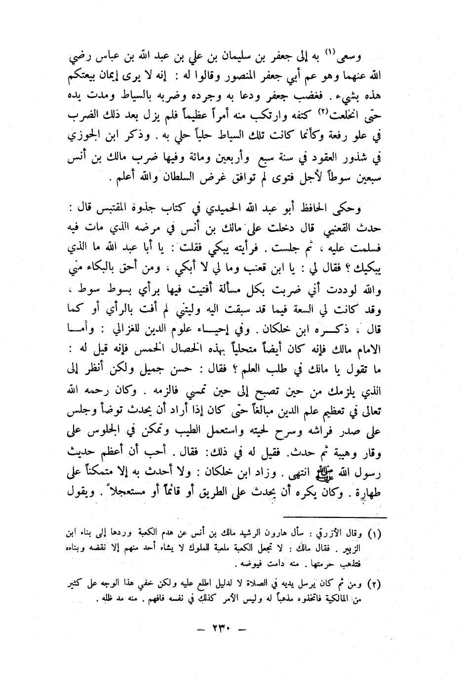 وسعى بِهِ إِلَى جَعْفَر بن سُلَيْمَان بن عَليّ بن عبد الله بن عَبَّاس رَضِي الله عَنْهُمَا وَهُوَ عَم أبي جَعْفَر الْمَنْصُور وَقَالُوا لَهُ إِنَّه لَا يرى إِيمَان بيعتكم هَذِه بِشَيْء فَغَضب جَعْفَر ودعا بِهِ وجرده وضربه بالسياط ومدت يَده حَتَّى انخلعت كتفه وارتكب مِنْهُ أمرا عَظِيما فَلم يزل بعد ذَلِك الضَّرْب فِي علو رفْعَة وكأنما كَانَت تِلْكَ السِّيَاط حليا حلي بِهِ وَذكر ابْن الْجَوْزِيّ فِي شذور الْعُقُود فِي سنة سبع وَأَرْبَعين وَمِائَة وفيهَا ضرب مَالك بن أنس سبعين سَوْطًا لأجل فَتْوَى لم توَافق غَرَض السُّلْطَان وَالله أعلم