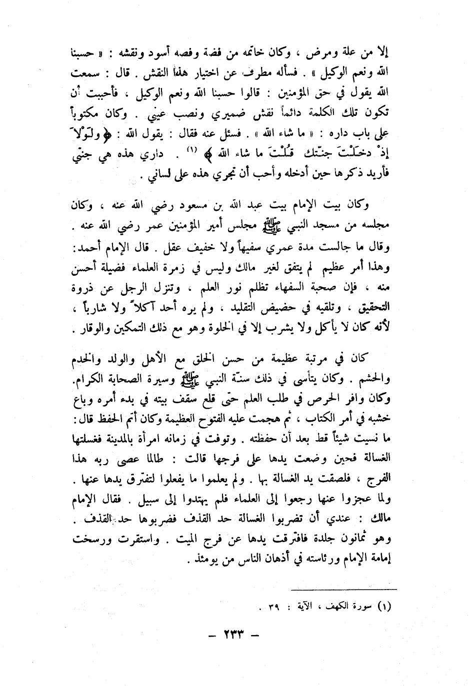وَكَانَ بَيت الإِمَام بَيت عبد الله بن مَسْعُود رَضِي الله عَنهُ وَكَانَ مَجْلِسه من مَسْجِد النَّبِي صلى الله عَلَيْهِ وَسلم مجْلِس أَمِير الْمُؤمنِينَ عمر رَضِي الله عَنهُ وَقَالَ مَا جالست مُدَّة عمري سَفِيها وَلَا خَفِيف عقل قَالَ الإِمَام أَحْمد وَهَذَا أَمر عَظِيم لم يتَّفق لغير مَالك وَلَيْسَ فِي زمرة الْعلمَاء فَضِيلَة أحسن مِنْهُ فَإِن صُحْبَة السُّفَهَاء تظلم نور الْعلم وتنزل الرجل عَن ذرْوَة التَّحْقِيق وتلقيه فِي حضيض التَّقْلِيد وَلم يره أحد آكلا وَلَا شاربا لِأَنَّهُ كَانَ لَا يَأْكُل وَلَا يشرب إِلَّا فِي الْخلْوَة وَهُوَ مَعَ ذَلِك التَّمْكِين وَالْوَقار