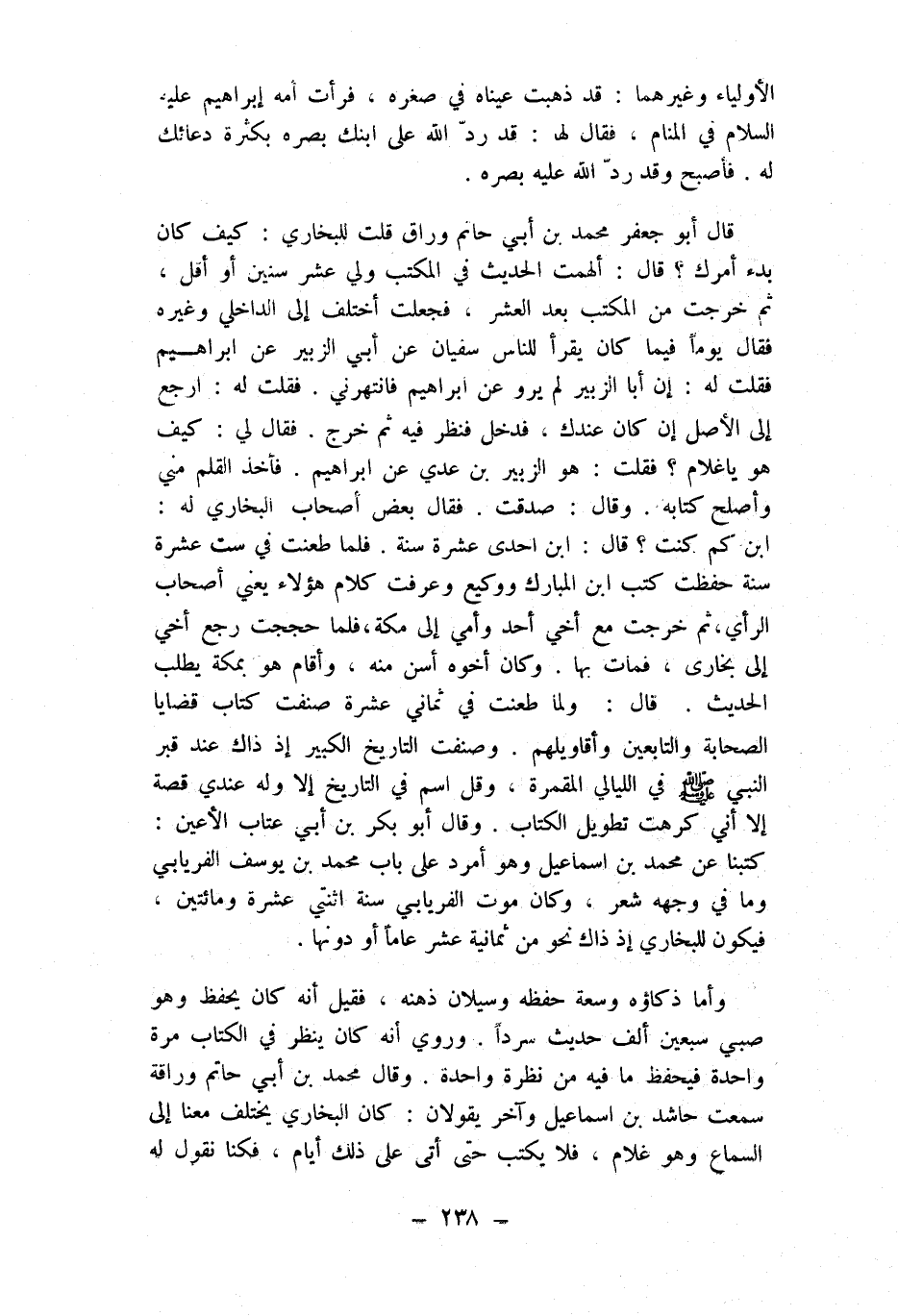 قَالَ أَبُو جَعْفَر مُحَمَّد بن أبي حَاتِم وراق قلت للْبُخَارِيّ كَيفَ كَانَ بَدْء أَمرك قَالَ ألهمت الحَدِيث فِي الْمكتب ولي عشر سِنِين أَو أقل ثمَّ خرجت من الْمكتب بعد الْعشْر فَجعلت أختلف إِلَى الداخلي وَغَيره فَقَالَ يَوْمًا فِيمَا كَانَ يقْرَأ للنَّاس سُفْيَان عَن أبي الزبير عَن إِبْرَاهِيم فَقلت لَهُ إِن أَبَا الزبير لم يرو عَن إِبْرَاهِيم فَانْتَهرنِي فَقلت لَهُ ارْجع إِلَى الأَصْل إِن كَانَ عنْدك فَدخل فَنظر فِيهِ ثمَّ خرج فَقَالَ لي كَيفَ هُوَ يَا غُلَام فَقلت هُوَ الزبير بن عدي عَن إِبْرَهِيمُ فَأخذ الْقَلَم مني وَأصْلح كِتَابه وَقَالَ صدقت فَقَالَ بعض أَصْحَاب البُخَارِيّ لَهُ ابْن كم كنت قَالَ ابْن احدى عشرَة سنة فَلَمَّا طعنت فِي سِتّ عشرَة سنة حفظت كتب ابْن الْمُبَارك ووكيع وَعرفت كَلَام هَؤُلَاءِ يَعْنِي أَصْحَاب الرَّأْي ثمَّ خرجت مَعَ أخي أَحْمد وَأمي إِلَى مَكَّة فَلَمَّا حججْت رَجَعَ أخي إِلَى بُخَارى فَمَاتَ بهَا وَكَانَ أَخُوهُ أسن مِنْهُ وَأقَام هُوَ بِمَكَّة يطْلب الحَدِيث قَالَ وَلما طعنت فِي ثَمَانِي عشرَة صنفت كتاب قضايا الصَّحَابَة وَالتَّابِعِينَ وأقاويلهم وصنفت التَّارِيخ الْكَبِير إِذْ ذَاك عِنْد قبر النَّبِي صلى الله عَلَيْهِ وَسلم فِي اللَّيَالِي المقمرة وَقل اسْم فِي التَّارِيخ إِلَّا وَله عِنْدِي قصَّة إِلَّا أَنِّي كرهت تَطْوِيل الْكتاب وَقَالَ أَبُو بكر بن أبي عتاب الْأَعْين كتبنَا عَن مُحَمَّد بن اسماعيل وَهُوَ أَمْرَد على بَاب مُحَمَّد بن يُوسُف الْفرْيَابِيّ وَمَا فِي وَجه شعر وَكَانَ موت الْفرْيَابِيّ سنة اثْنَتَيْ عشرَة وَمِائَتَيْنِ فَيكون للْبُخَارِيّ إِذْ ذَاك نَحْو من ثَمَانِيَة عشر عَاما أَو دونهَا