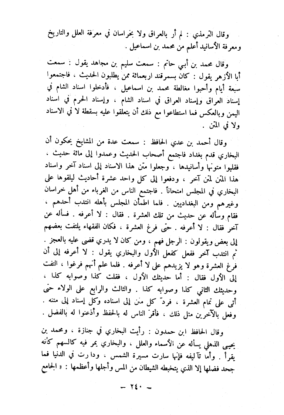 وَقَالَ التِّرْمِذِيّ لم أر بالعراق وَلَا بخراسان فِي معرفَة الْعِلَل والتاريخ وَمَعْرِفَة الْأَسَانِيد أعلم من مُحَمَّد بن اسماعيل