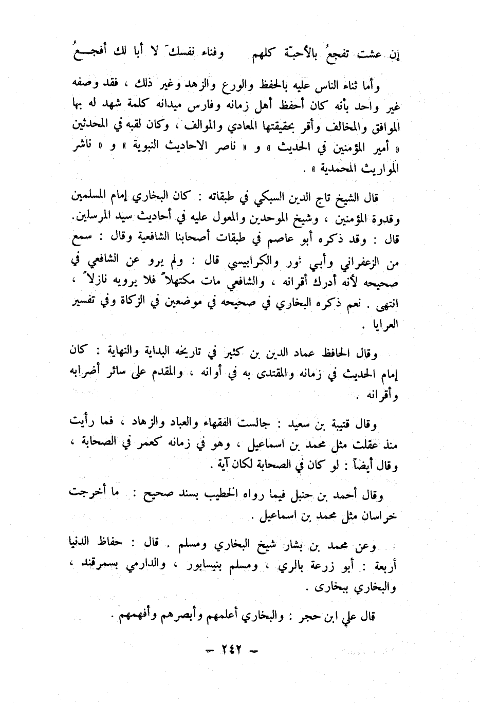 وَأما ثَنَاء النَّاس عَلَيْهِ بِالْحِفْظِ والورع والزهد وَغير ذَلِك فقد وَصفه غير وَاحِد بِأَنَّهُ كَانَ أحفظ أهل زَمَانه وَفَارِس ميدانه كلمة شهد لَهُ بهَا الْمُوَافق والمخالف وَأقر بحقيقتها المعادي والموالف وَكَانَ لقبه فِي الْمُحدثين أَمِير الْمُؤمنِينَ فِي الحَدِيث وناصر الْأَحَادِيث النَّبَوِيَّة وناشر الْمَوَارِيث المحمدية