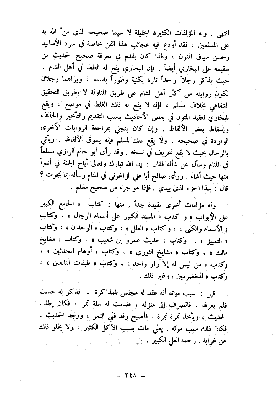 انْتهى وَله المؤلفات الْكَثِيرَة الجليلة لَا سِيمَا صَحِيحه الَّذِي من الله بِهِ على الْمُسلمين فقد أودع فِيهِ عجائب هَذَا الْفَنّ خَاصَّة فِي سرد الْأَسَانِيد وَحسن سِيَاق الْمُتُون وَلِهَذَا كَانَ يقدم فِي معرفَة صَحِيح الحَدِيث من سقيمه على البُخَارِيّ أَيْضا فَإِن البُخَارِيّ يَقع لَهُ الْغَلَط فِي أهل الشَّام حَيْثُ يذكر رجلا وَاحِدًا تَارَة بكنية وطورا باسمه ويراهما رجلَانِ لكَون رِوَايَته عَن أَكثر أهل الشَّام على طَرِيق المناولة لَا بطرِيق التَّحْقِيق الشفاهي بِخِلَاف مُسلم فَإِنَّهُ لَا يَقع لَهُ ذَلِك الْغَلَط فِي مَوضِع وَيَقَع للْبُخَارِيّ تعقيد الْمُتُون فِي بعض الْأَحَادِيث بِسَبَب التَّقْدِيم وَالتَّأْخِير والحذف وَإِسْقَاط بعض الْأَلْفَاظ وَإِن كَانَ ينجلي بمراجعة الرِّوَايَات الْأُخْرَى الْوَارِدَة فِي صَحِيحه وَلَا يَقع ذَلِك لمُسلم فَإِنَّهُ يَسُوق الْأَلْفَاظ وَيَأْتِي بِالرِّجَالِ بِحَيْثُ لَا يَقع تَحْرِيف فِي نسخه وَقد رأى أَبُو حَاتِم الرَّازِيّ مُسلما فِي الْمَنَام وَسَأَلَ عَن شَأْنه فَقَالَ إِن الله تبَارك وَتَعَالَى أَبَاحَ الْجنَّة لي أتبوأ مِنْهَا حَيْثُ أَشَاء وَرَأى صَالح أَبَا عَليّ الزَّاغُونِيّ فِي الْمَنَام وَسَأَلَهُ بِمَا نجوت قَالَ بِهَذَا الْجُزْء الَّذِي بيَدي فَإِذا هُوَ جُزْء من صَحِيح مُسلم