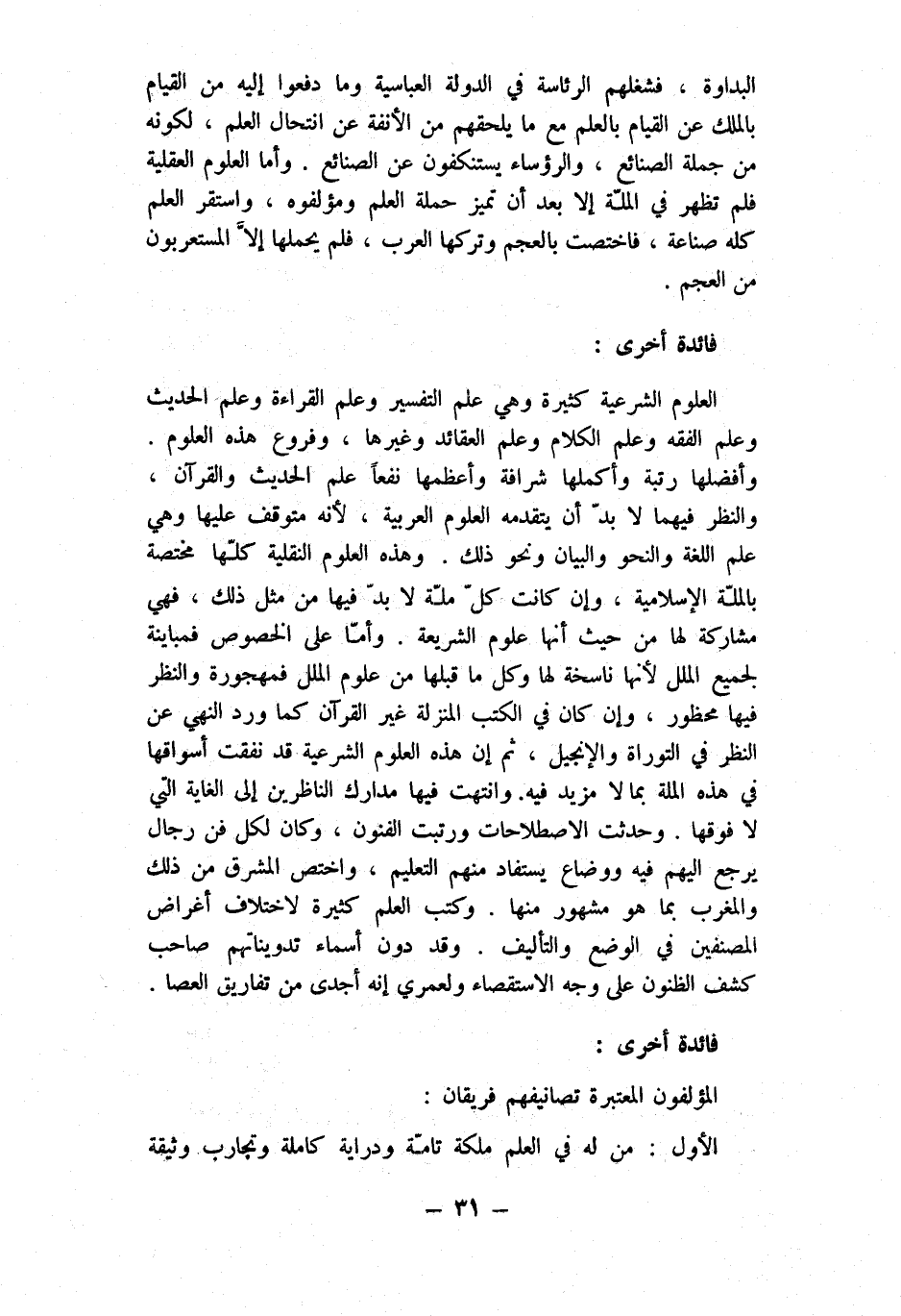 الْعُلُوم الشَّرْعِيَّة كَثِيرَة وَهِي علم التَّفْسِير وَعلم الْقِرَاءَة وَعلم الحَدِيث وَعلم الْفِقْه وَعلم الْكَلَام وَعلم العقائد وَغَيرهَا وفروع هَذِه الْعُلُوم وأفضلها رُتْبَة وأكملها شرافة وأعظهما نفعا علم الحَدِيث وَالْقُرْآن وَالنَّظَر فيهمَا لَا بُد أَن يتقدمه الْعُلُوم الْعَرَبيَّة لِأَنَّهُ مُتَوَقف عَلَيْهَا وَهِي علم اللُّغَة والنحو وَالْبَيَان وَنَحْو ذَلِك وَهَذِه الْعُلُوم النقلية كلهَا مُخْتَصَّة بالملة الإسلامية وَإِن كَانَت كل مِلَّة لَا بُد فِيهَا من مثل ذَلِك فَهِيَ مُشَاركَة لَهَا من حَيْثُ أَنَّهَا عُلُوم الشَّرِيعَة وَأما على الْخُصُوص فمباينة لجَمِيع الْملَل لِأَنَّهَا ناسخة لَهَا وكل مَا قبلهَا من عُلُوم الْملَل فمهجورة وَالنَّظَر فِيهَا مَحْظُور وَإِن كَانَ فِي الْكتب الْمنزلَة غير الْقُرْآن كَمَا ورد النَّهْي عَن النّظر فِي التَّوْرَاة وَالْإِنْجِيل ثمَّ إِن هَذِه الْعُلُوم الشَّرْعِيَّة قد نفقت أسواقها فِي هَذِه الْملَّة بِمَا لَا مزِيد فِيهِ وانتهت فِيهَا مدارك الناظرين إِلَى الْغَايَة الَّتِي لَا فَوْقهَا وَحدثت الاصطلاحات ورتبت الْفُنُون وَكَانَ لكل فن رجال يرجع إِلَيْهِم فِيهِ ووضاع يُسْتَفَاد مِنْهُم التَّعْلِيم واختص الْمشرق من ذَلِك وَالْمغْرب بِمَا هُوَ مَشْهُور مِنْهَا وَكتب الْعلم كَثِيرَة لاخْتِلَاف أغراض المصنفين فِي الْوَضع والتأليف وَقد دون أَسمَاء تدويناتهم صَاحب كشف الظنون على وَجه الِاسْتِقْصَاء ولعمري إِنَّه أجدى من تفاريق الْعَصَا فَائِدَة أُخْرَى