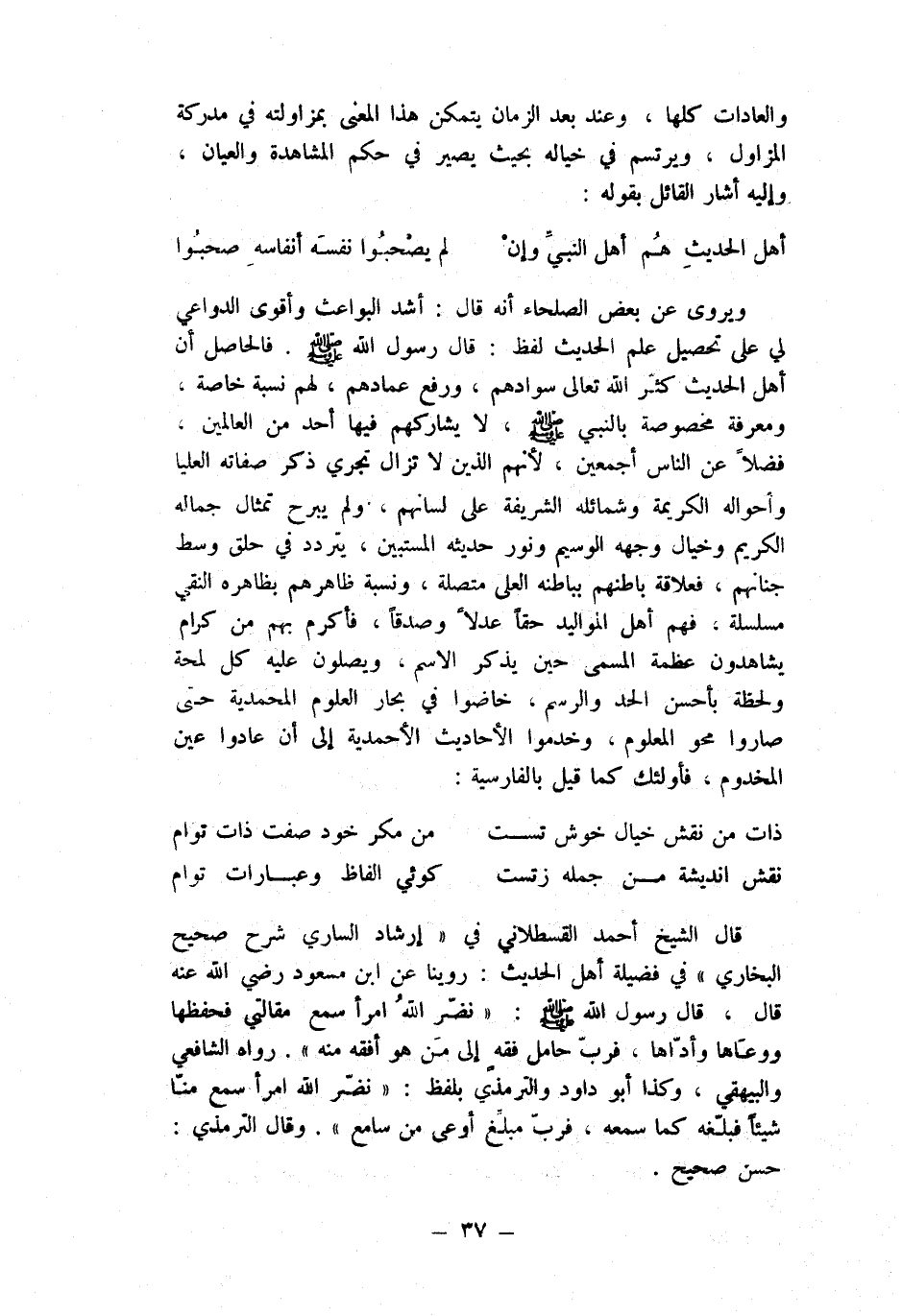 قَالَ الشَّيْخ أَحْمد الْقُسْطَلَانِيّ فِي إرشاد الساري شرح صَحِيح البُخَارِيّ فِي فَضِيلَة أهل الحَدِيث روينَا عَن ابْن مَسْعُود رَضِي الله عَنهُ قَالَ قَالَ رَسُول الله صلى الله عَلَيْهِ وَسلم نضر الله أمرأ سمع مَقَالَتي فحفظها ووعاها وأداها فَرب حَامِل فقه إِلَى من هُوَ أفقه مِنْهُ رَوَاهُ الشَّافِعِي وَالْبَيْهَقِيّ وَكَذَا أَبُو دَاوُد وَالتِّرْمِذِيّ بِلَفْظ نضر الله امْرأ سمع منا شَيْئا فَبَلغهُ كَمَا سَمعه فَرب مبلغ أوعى من سامع وَقَالَ التِّرْمِذِيّ حسن صَحِيح