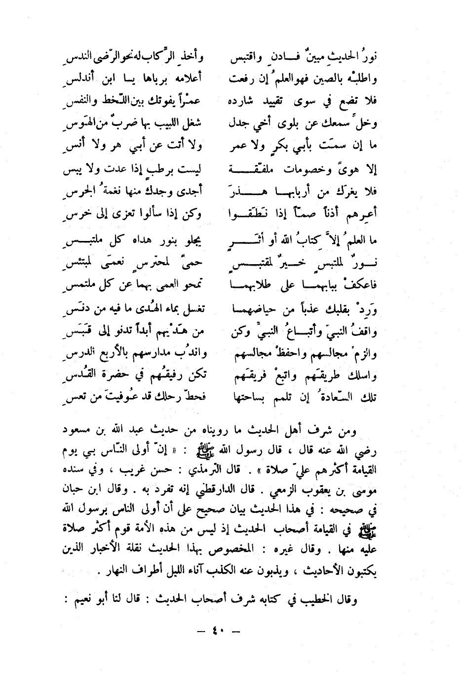 وَمن شرف أهل الحَدِيث مَا روينَاهُ من حَدِيث عبد الله بن مَسْعُود رَضِي الله عَنهُ قَالَ قَالَ رَسُول الله صلى الله عَلَيْهِ وَسلم إِن أولى النَّاس بِي يَوْم الْقِيَامَة أَكْثَرهم عَليّ صَلَاة قَالَ التِّرْمِذِيّ حسن غَرِيب وَفِي سَنَده مُوسَى بن يَعْقُوب الزمعِي قَالَ الدَّارَقُطْنِيّ إِنَّه تفرد بِهِ وَقَالَ ابْن حبَان فِي صَحِيحه فِي هَذَا الحَدِيث بَيَان صَحِيح على أَن أولى النَّاس برَسُول الله صلى الله عَلَيْهِ وَسلم فِي الْقِيَامَة أَصْحَاب الحَدِيث إِذْ لَيْسَ من هَذِه الْأمة قوم أَكثر صَلَاة عَلَيْهِ مِنْهَا وَقَالَ غَيره الْمَخْصُوص بِهَذَا الحَدِيث نقلة الْأَخْبَار الَّذين يَكْتُبُونَ الْأَحَادِيث ويذبون عَنهُ الْكَذِب أناء اللَّيْل أَطْرَاف النَّهَار