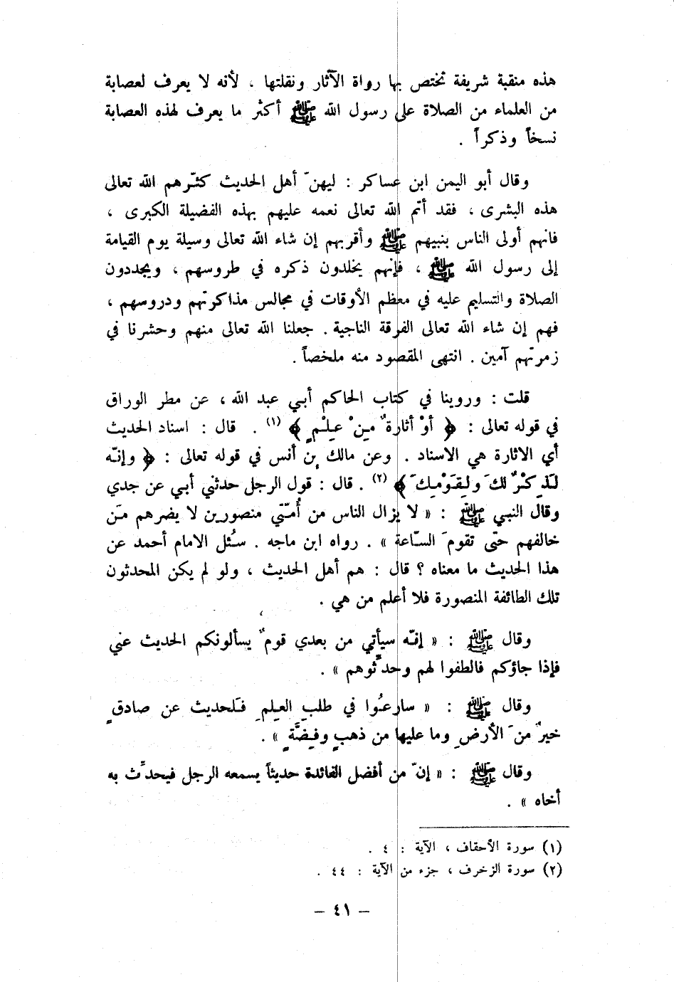 وَقَالَ أَبُو الْيمن ابْن عَسَاكِر لِيهن أهل الحَدِيث كثرهم الله تَعَالَى هَذِه الْبُشْرَى فقد أتم الله تَعَالَى نعمه عَلَيْهِم بِهَذِهِ الْفَضِيلَة الْكُبْرَى فَإِنَّهُم أولى النَّاس بِنَبِيِّهِمْ صلى الله عَلَيْهِ وَسلم وأقربهم إِن شَاءَ الله تَعَالَى وَسِيلَة يَوْم الْقِيَامَة إِلَى رَسُول الله صلى الله عَلَيْهِ وَسلم فَإِنَّهُم يخلدُونَ ذكره فِي طروسهم ويجددون الصَّلَاة وَالتَّسْلِيم عَلَيْهِ فِي مُعظم الْأَوْقَات فِي مجَالِس مذاكرتهم ودروسهم فهم إِن شَاءَ الله تَعَالَى الْفرْقَة النَّاجِية جعلنَا الله تَعَالَى مِنْهُم وحشرنا فِي زمرتهم آمين انْتهى الْمَقْصُود مِنْهُ مُلَخصا