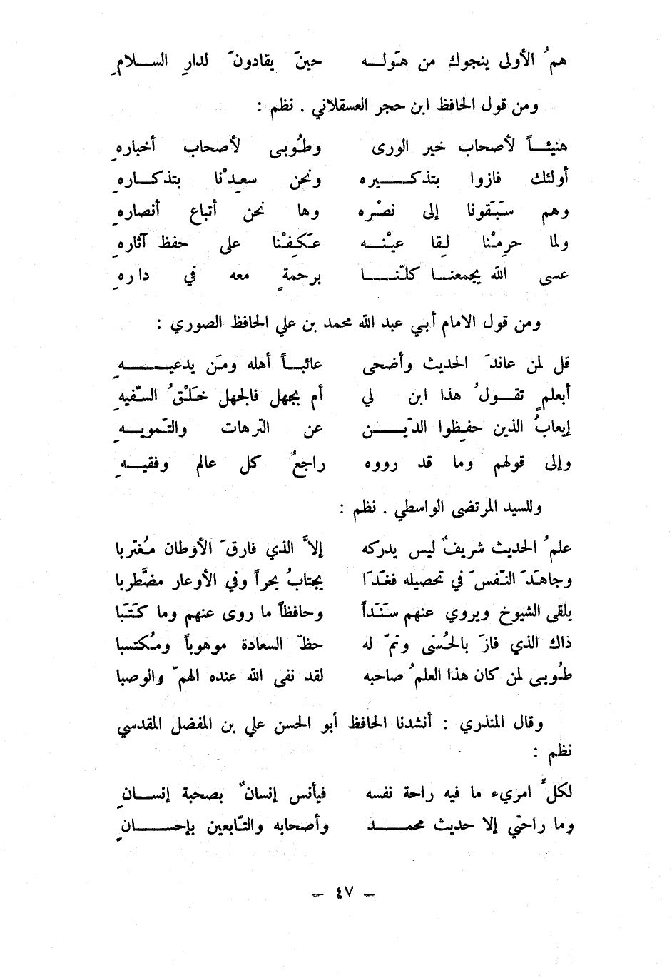 (وَمَا راحتي إِلَّا حَدِيث مُحَمَّد ... وَأَصْحَابه وَالتَّابِعِينَ بِإِحْسَان)