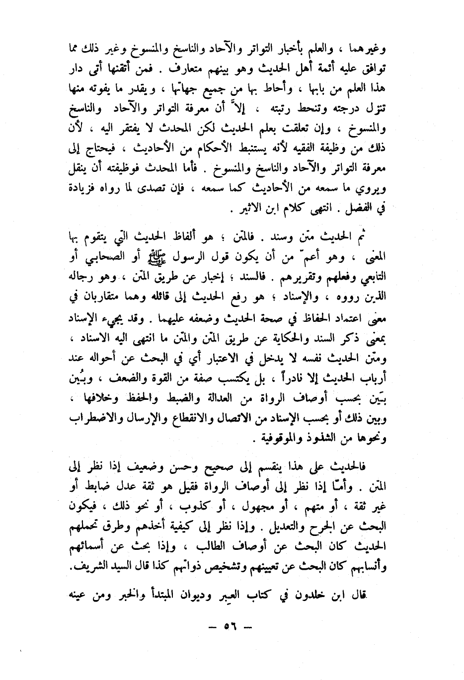 وَغَيرهمَا وَالْعلم بأخبار التَّوَاتُر والآحاد والناسخ والمنسوخ وَغير ذَلِك مِمَّا توَافق عَلَيْهِ أَئِمَّة أهل الحَدِيث وَهُوَ بَينهم مُتَعَارَف فَمن أتقنها أَتَى دَار هَذَا الْعلم من بَابهَا وأحاط بهَا من جَمِيع جهاتها وَيقدر مَا يفوتهُ مِنْهَا تنزل دَرَجَته وتنحط رتبته إِلَّا أَن معرفَة التَّوَاتُر والآحاد والناسخ والمنسوخ وَإِن تعلّقت بِعلم الحَدِيث لَكِن الْمُحدث لَا يفْتَقر إِلَيْهِ لِأَن ذَلِك من وَظِيفَة الْفَقِيه لِأَنَّهُ يستنبط الْأَحْكَام من الْأَحَادِيث فَيحْتَاج إِلَى معرفَة التَّوَاتُر والآحاد والناسخ والمنسوخ فَأَما الْمُحدث فوظيفته أَن ينْقل ويروي مَا سَمعه من الْأَحَادِيث كَمَا سَمعه فَإِن تصدى لما رَوَاهُ فَزِيَادَة فِي الْفضل انْتهى كَلَام ابْن الْأَثِير